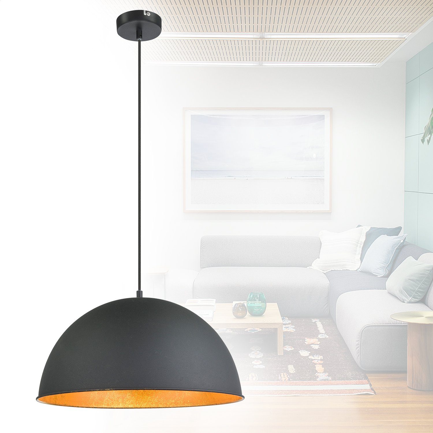 Wissenswertes | HÄNGELAMPE - SCHWARZ - INNEN GOLD Stilvolle Hängeleuchte in Schwarz mit Gold 1x E27 mit 60 Watt - Metall - schwarz - gold - IP20 - inkl. Pflegetuch halbkugelförmige Hängeleuchte in außergewöhnlichem Design Diese Hängeleuchte wird zum Highlight im Raum mit sehr individueller Optik. Die schwarze Lampe ist im Inneren des Lampenschirms in Gold gestaltet, was das Licht besonders schön erscheinen lässt. Die Leuchte benötigt 1x E27-Leuchtmittel mit 60 Watt. Die Leuchtmittel sind nicht im Lieferumfang enthalten. |