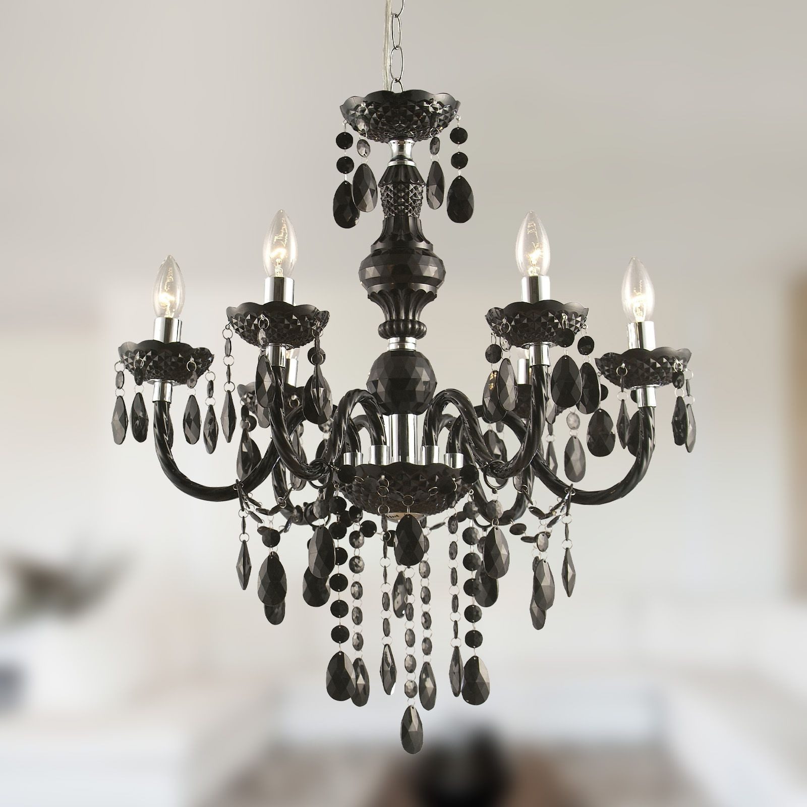 Wissenswertes | KRONLEUCHTER - KRISTALLE - SCHWARZ Dieser elegante traditionelle Luster zeichnet sich durch sein vintage Design, sowie durch seine hochwertige Verarbeitung aus. Bei der Anfertigung dieser Hängelampe wurde schwarzes Chrom gewählt. Die daran herabhängenden Acrylkristalle verleihen dieser Lampe eine stilvolle Optik. Mit einem Durchmesser von 67 cm, ragt diese Hängelampe mit 1,66 Meter in den Raum. Die sechs an den gebogenen Armen montierten E14 Fassungen, bieten Ihnen die Möglichkeit beliebige Leuchtmittel (max. 40W) einzusetzen. Wir empfehlen Ihnen LED-Leuchtmittel aufgrund ihrer Langlebigkeit und Stromersparnis. |