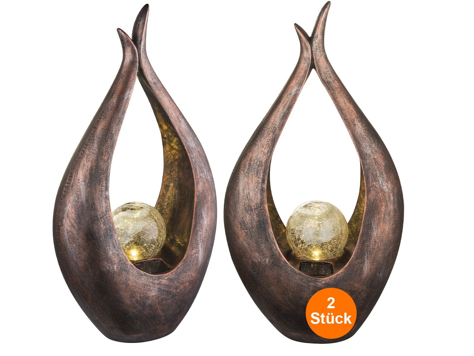 Diese Solarlampen sehen aus wie ein Kunstwerk. Das Zusammenspiel aus bronzefarbenem Kunststoff, klarem Glas und zerbrochener Glasoptik (Crackle-Glas) sieht elegant und edel aus. Zwei tolle Gartenleuchten.