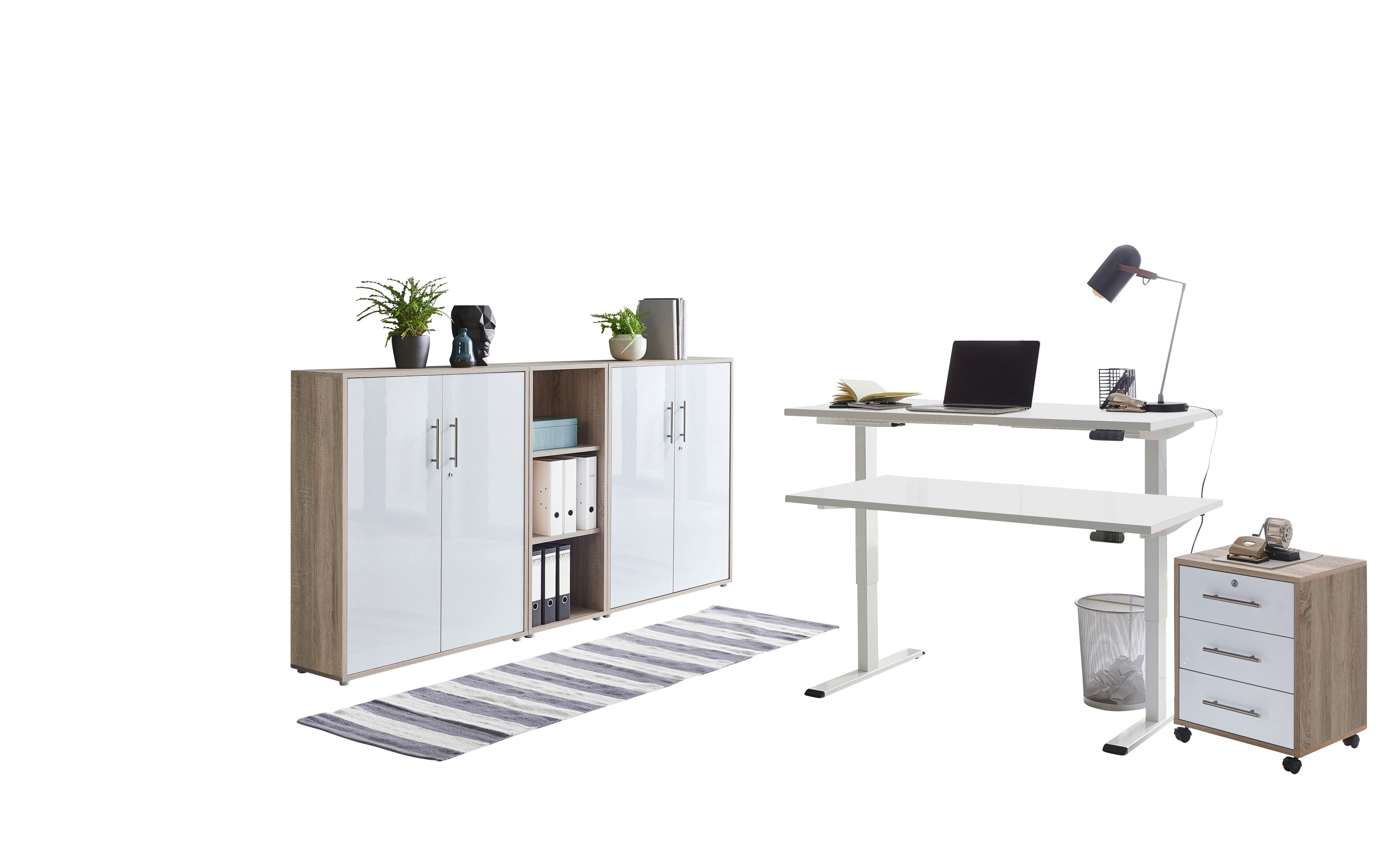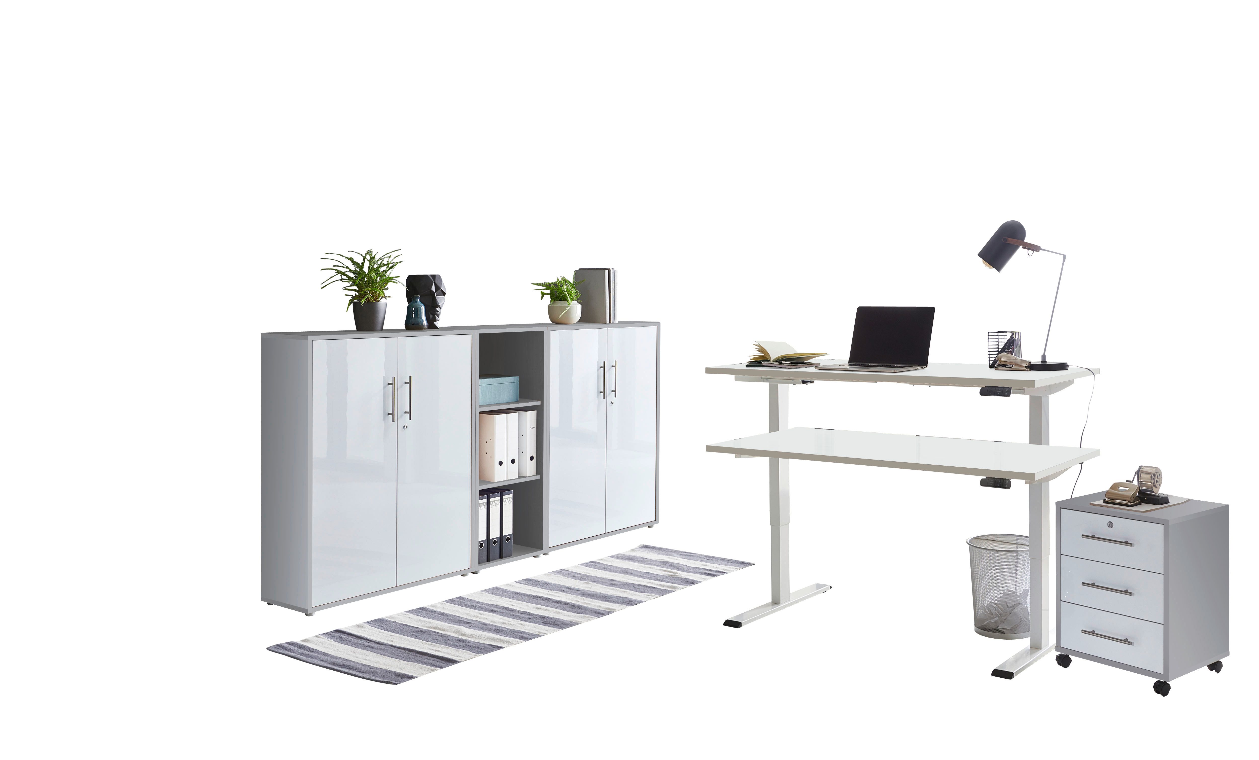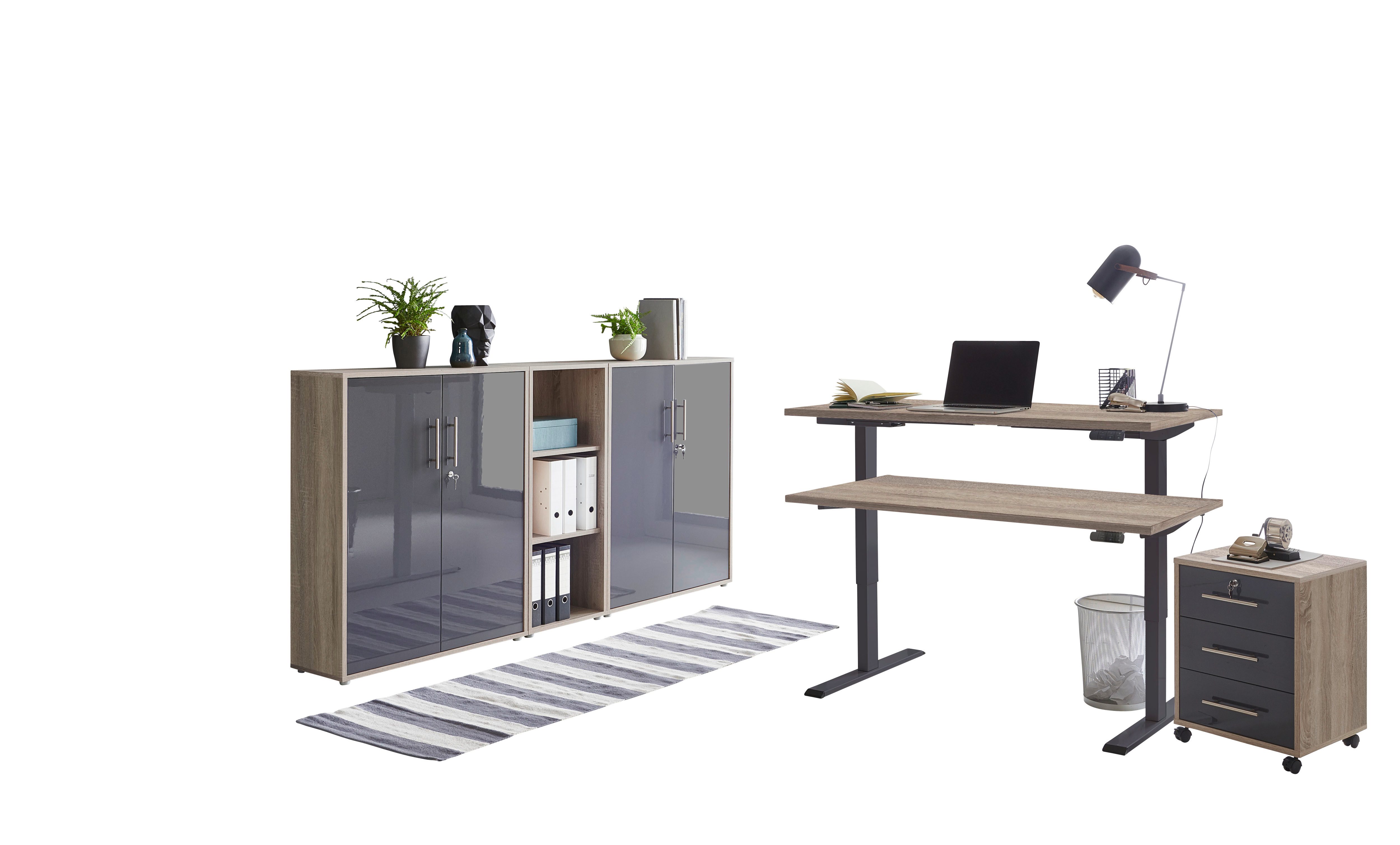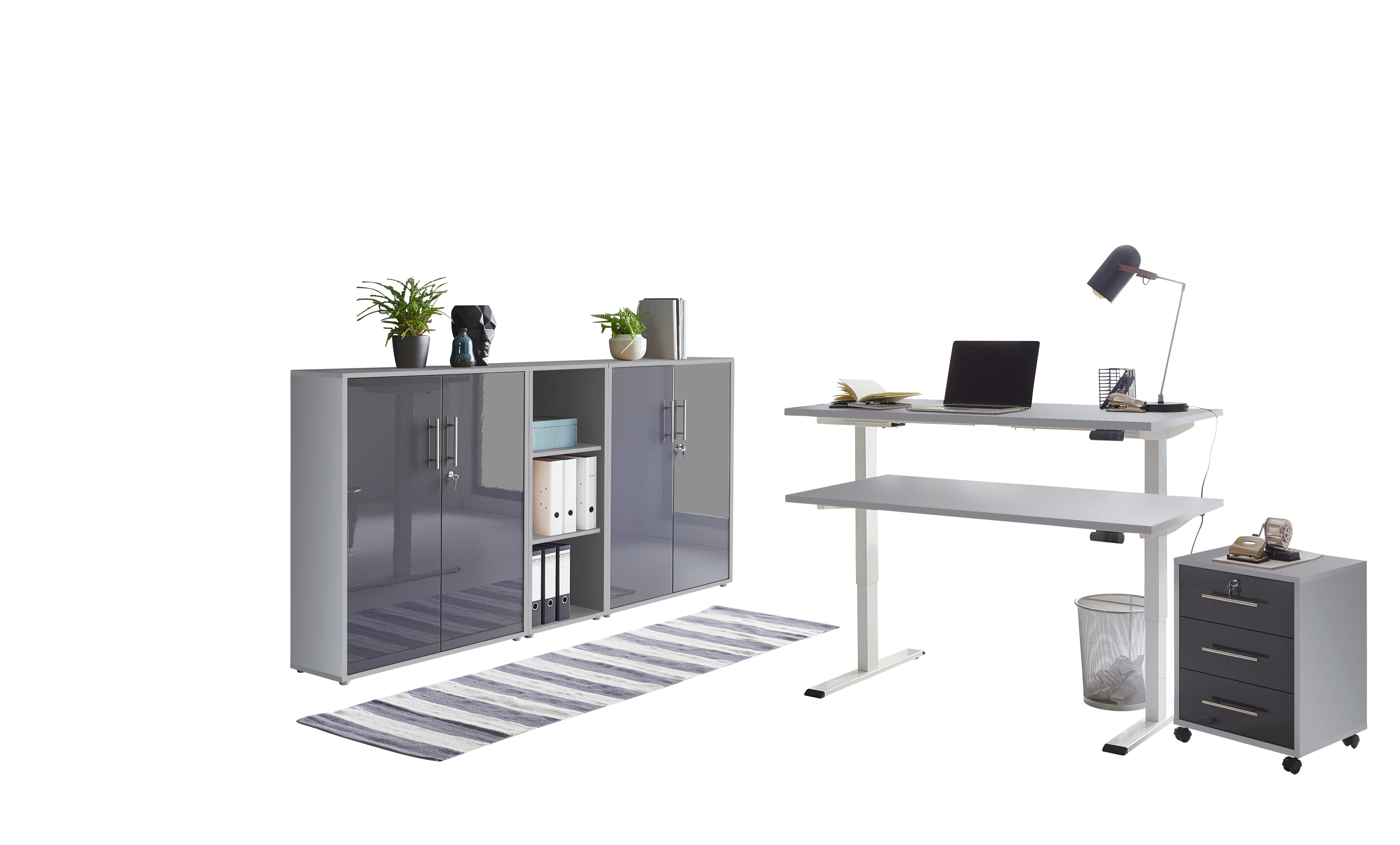 Set beinhaltet | elektrisch höhenverstellbarer Schreibtisch, Rollcontainer, Schrankwand bestehend aus 2x Aktenschrank breit/niedrig und 1x Aktenregal schmal/niedrig |