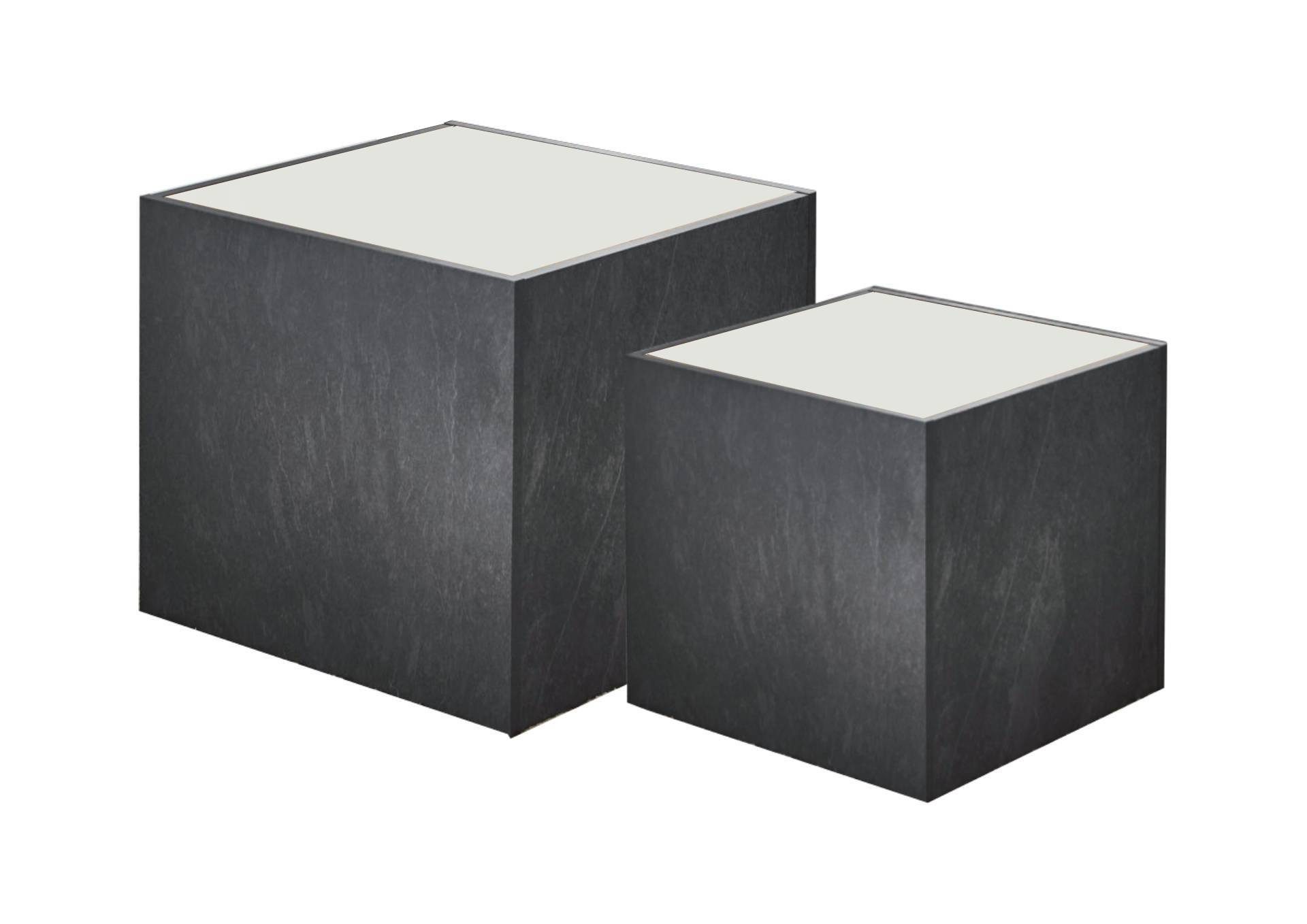 Das moderne Couchtisch-Set in Schiefer-Weiß überzeugt mit Stil und Funktionalität. Bestehend aus einem großen Würfel (50 x 40 x 50 cm) und einem kleineren Würfel (43 x 35 x 43 cm), sind die Tische flexibel einsetzbar und ineinander stapelbar, um Platz zu sparen. Mit einer robusten Materialstärke von 1,5 cm und „Made in Germany“-Qualität vereint das Set zeitloses Design und hohe Langlebigkeit.
