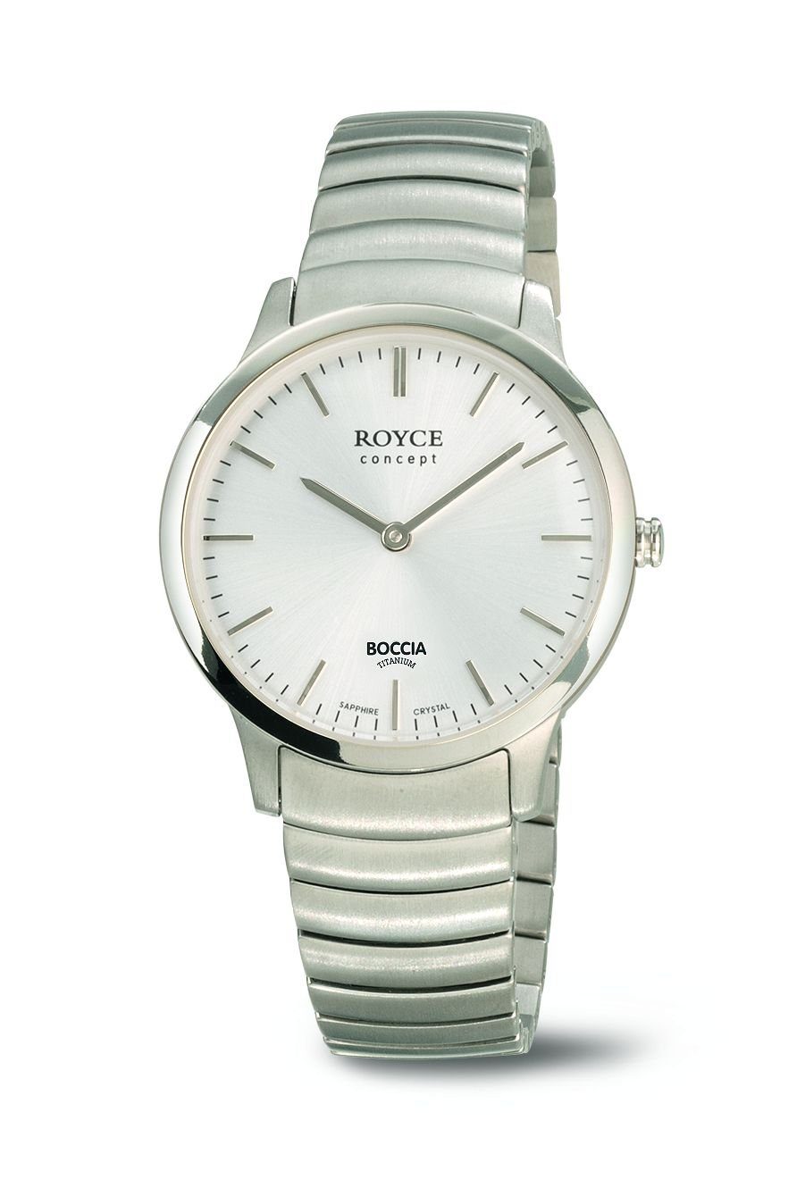 Durch das flache Gehäuse und Band lässt sich die elegante Boccia Damenuhr sehr angenehm tragen. Die traumhafte Armbanduhr ist aus Titan hergestellt mit einem kratzfesten Saphirglas und einem Quarz Werk. Das Titanband können wir gerne auf Anfrage für Ihr Handgelenk anpassen lassen. Das silberfarbene Ziffernblatt ist schlicht gehalten mit schmalen Indexen und Zeigern, die klar ablesbar sind. Dieses Modell ist aus der Royce Concept Kollektion von Boccia und ein elegantes Accessoire, dass Sie ohne Probleme zu jedem Anlass tragen können.