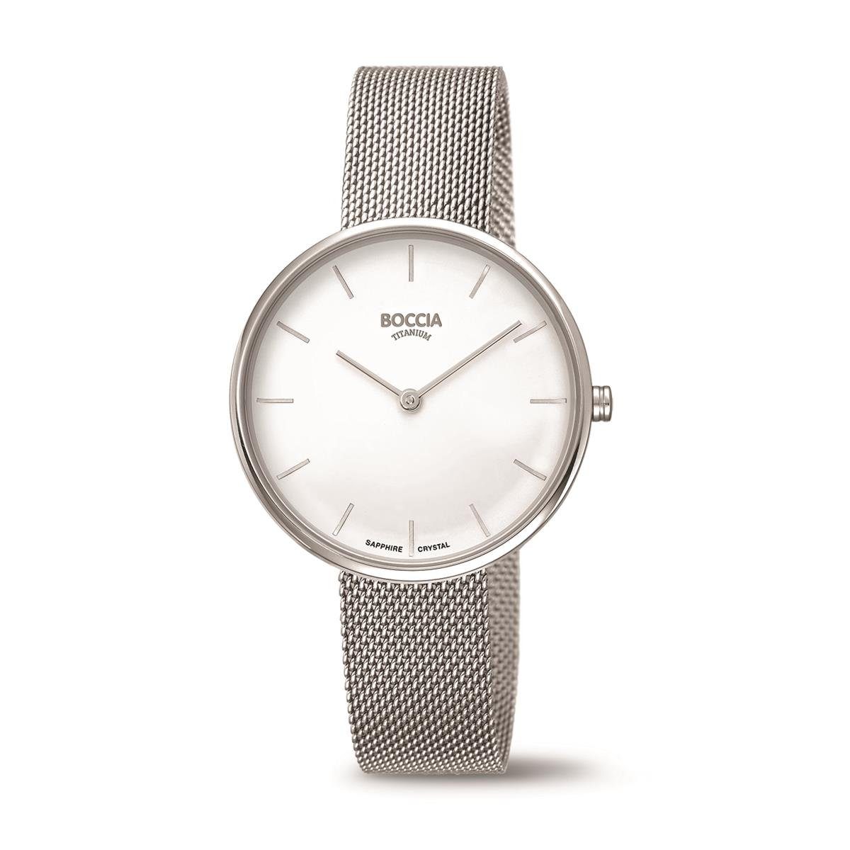 Die moderne Damenarmbanduhr von Boccia ist absolut im Trend. Sie ist aus Rein-Titan gefertigt und hat ein silberfarbenes Edelstahlband. Das klare, helle Zifferblatt hat schmale Indexe und Zeiger. Die Damenuhr hat ein Saphirglas und ist bis zu 3 ATM wasserdicht. Sie können das Modell von Boccia bedenkenlos zu jedem Anlass tragen. Das Modell gibt es in 2 weiteren Farben.