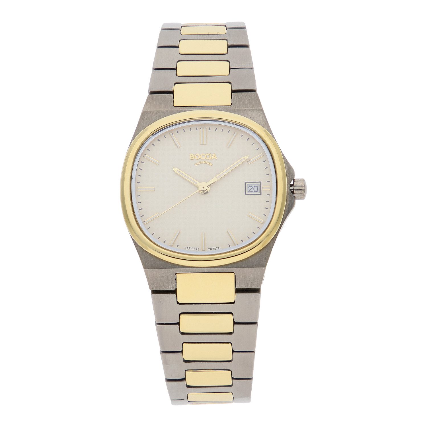 Diese stilvolle Damenuhr von Boccia besteht aus reinem Titan - einem extrem leichten, robusten und hautfreundlichen Material. Das kratzfeste Saphirglas schützt das Zifferblatt zuverlässig vor Beschädigungen und sorgt für klare Sicht bei jeder Gelegenheit. Ein integriertes Datumsfenster bietet zusätzliche Funktionalität im Alltag. Mit einer Wasserdichtigkeit von bis zu 5 bar (50 Meter) ist die Uhr auch für alltägliche Wasserkontakte bestens geeignet.