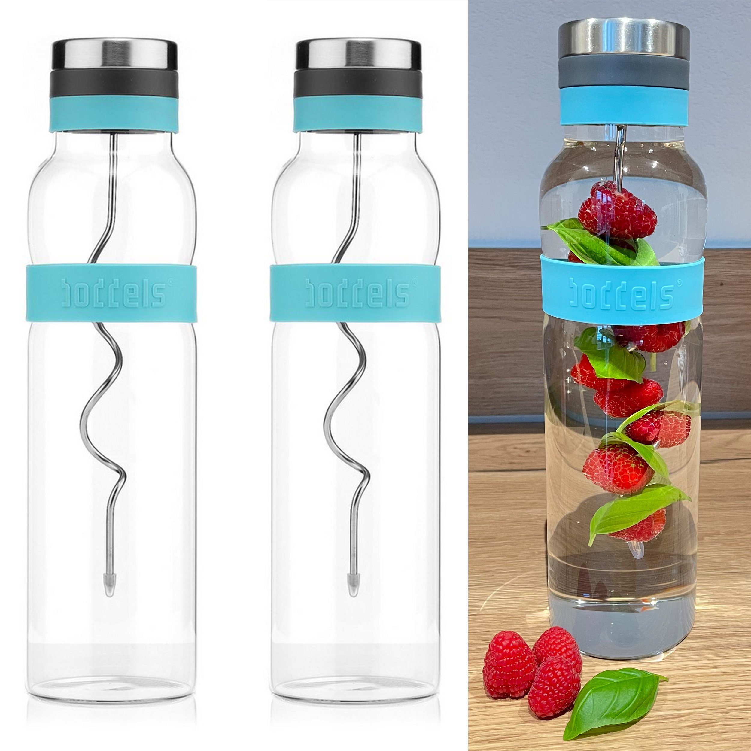 » 2 hochwertige Glaskaraffen aus Borosilikatglas mit Edelstahl Deckel und 2 Silikonringen. Diese Silikonringe geben beim Einschenken einen sicheren Halt und verhindern ein Tropfen nach dem Ausgießen. » Der Fruchtspieß und das integrierte Sieb lassen sich ganz einfach entnehmen, sollten diese einmal nicht benötigt werden. » Die Glaskaraffe, die einzelnen Utensilien und die Silikonringe sind für die Spülmaschine geeignet. » Für kalte und heiße Getränke, wie z. B. Tee, geeignet. » Maße ca. 30,5 cm hoch und 8 cm im Durchmesser. Fassungsvermögen 1.100 ml.