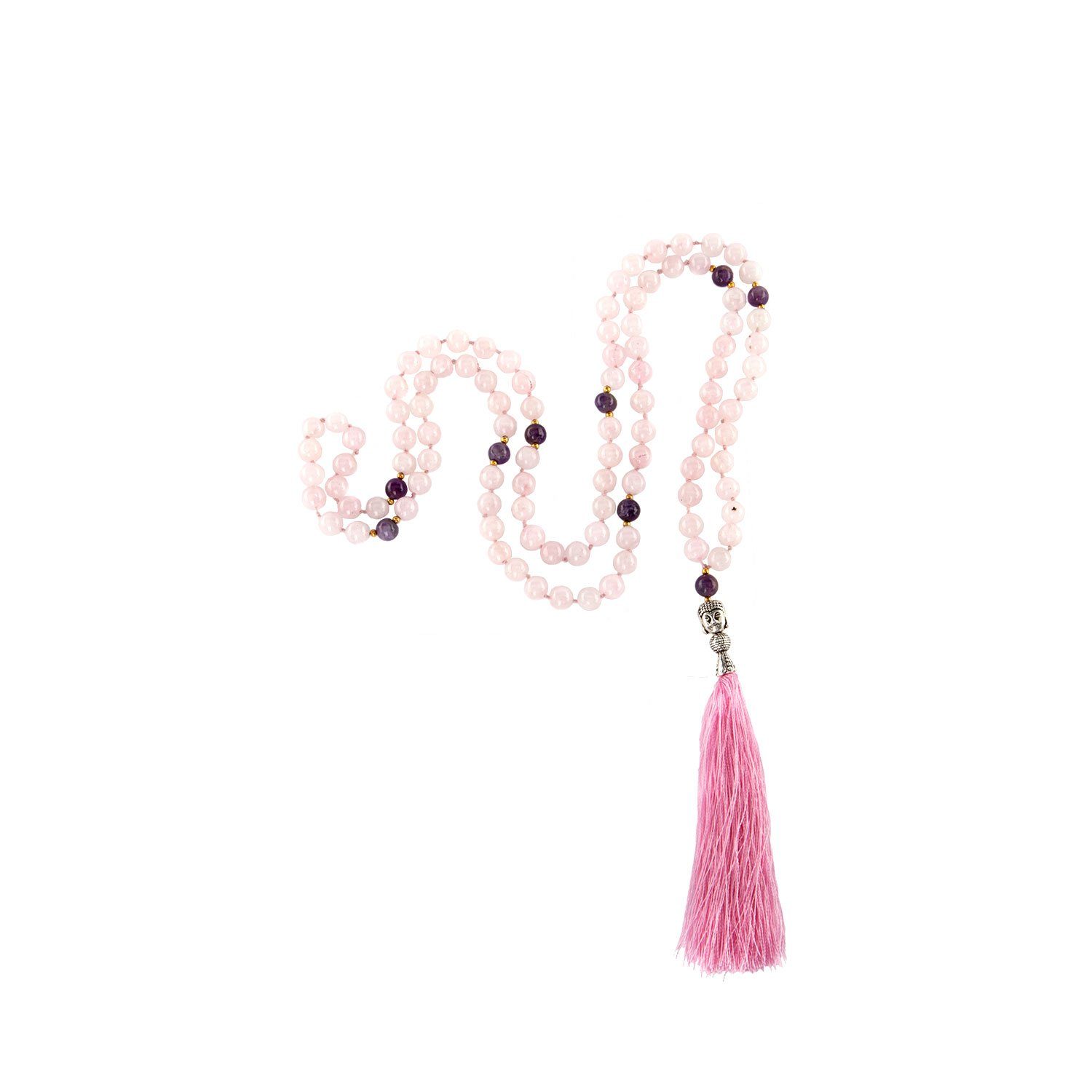 Diese schöne Mala Kette mit Rosenquarz und Amethyst besitzt 108 einzeln miteinander verknotete Perlen und ist mit einer pinken Quaste versehen. Der Durchmesser der Perlen beträgt ca. 7 mm.
