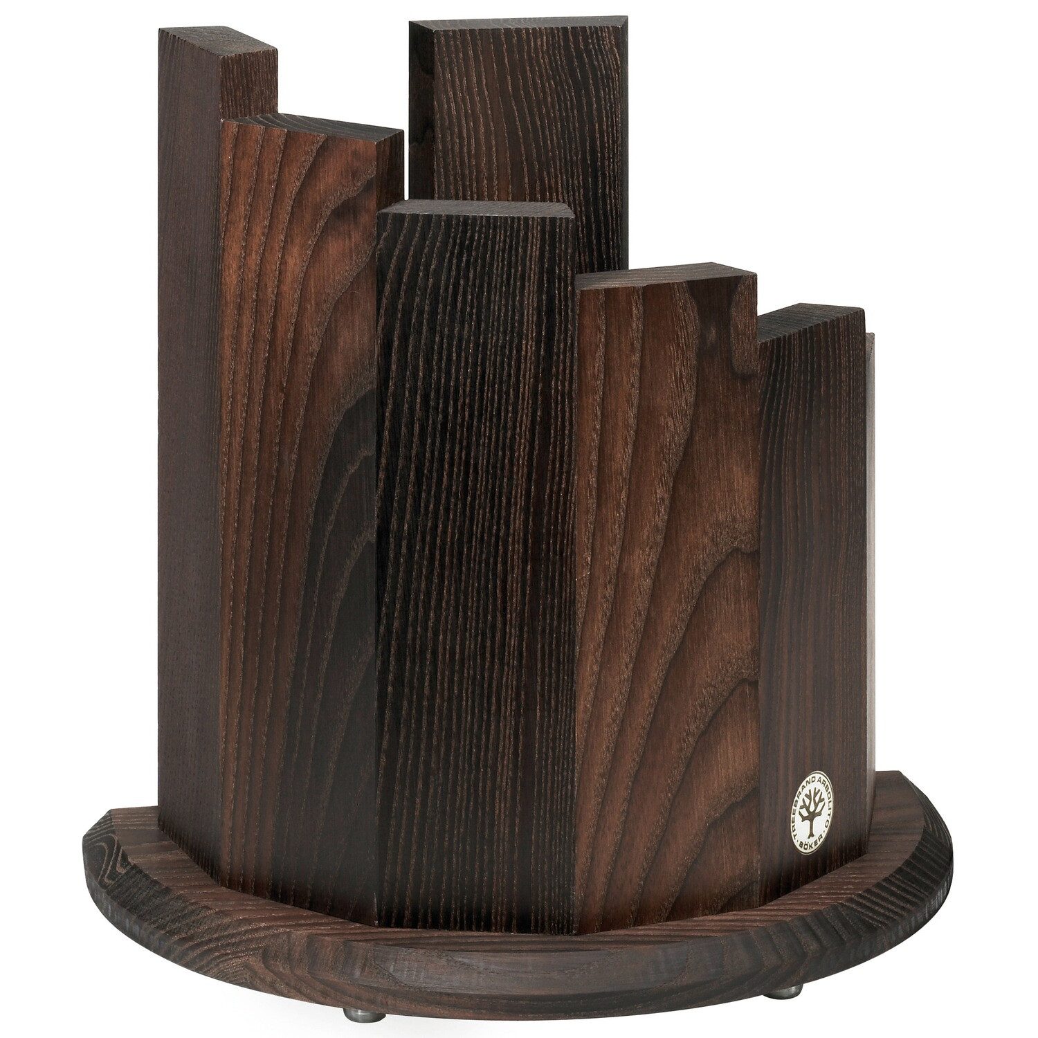 Der Böker Messerblock Circle besteht aus sieben Stelen aus Massivholz, die jeweils starke Magnete enthalten. Die Anordnung von sechs Stelen im Halbkreis sowie einer Stele in der Mitte, alle sicher montiert auf einer soliden Bodenplatte aus Massivholz, ermöglicht ein sicheres Aufbewahren von sieben hochwertigen Küchenmessern aller handelsüblicher Größen auf kleinem Raum. Ein zeit- und nervenraubendes Suchen nach der richtigen Klinge entfällt. Der Messerblock aus gebeiztem Eschenholz ist überaus praktisch zu handhaben, einfach zu reinigen und gibt hochwertigen Küchenmessern ein angemessenes Zuhause. Ein echter Blickfang in jeder Küche, komplett gefertigt in Europa. Впередe Produktdetails: Material: Eschenholz; Maße (LxBxT): 25,8x25,5x14,5 cm; Gewicht: 1,3 kg. Dieser Artikel enthält nichttextile Teile tierischen Ursprungs.