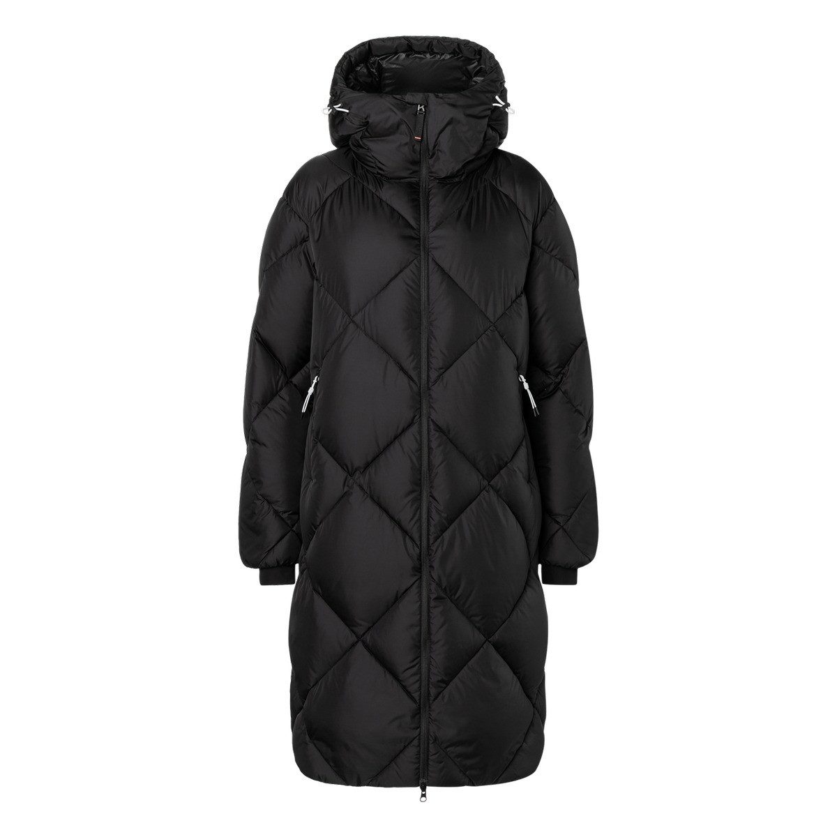 Komfortabel-leichter Nylon-Stepp mit wasserabweisendem Finish und eine hybride Daunen-Wattierung zeichnen den Steppmantel Beth als Favoriten aus. Der Look erhält durch den hohen Kragen und Rubber-Stopper an der Tunnelzugkapuze lässiges Flair, ergänzt durch Zip-Taschen und inwendige Ärmelbündchen aus Lycra.
