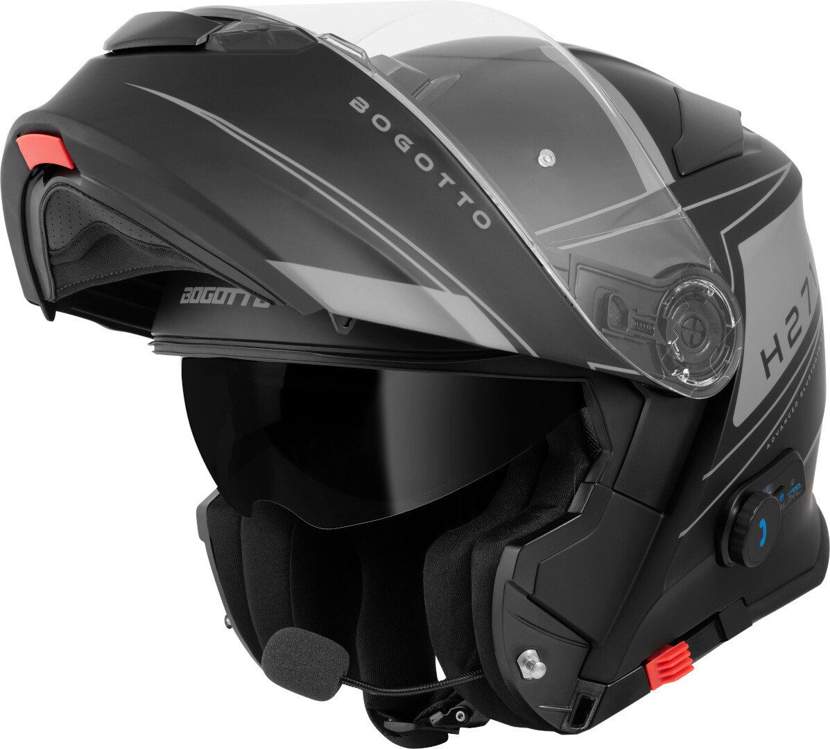 Der Bogotto H271 Taog Bluetooth Klapphelm kombiniert stylisches Design mit fortschrittlicher Technologie und ist die ideale Wahl für moderne Motorradfahrer. Mit seinem integrierten Bluetooth-Kommunikationssystem bleibst du jederzeit in Verbindung, ob bei Fahrten in der Stadt oder auf langen Touren. Das klare, Pinlock-vorbereitete Visier und das integrierte Sonnenvisier bieten dir optimale Sicht unter allen Bedingungen. Für zusätzlichen Komfort sorgt das herausnehmbare, waschbare Innenfutter, während das durchdachte Belüftungssystem stets für eine angenehme Luftzirkulation sorgt. Ein Helm, der in Sachen Funktionalität und Stil keine Wünsche offenlässt.