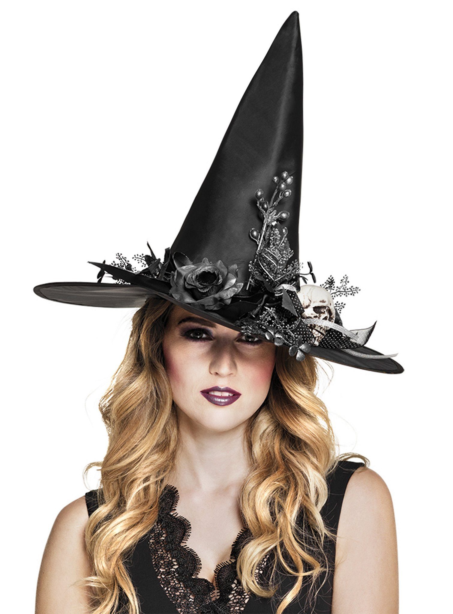Dieser ausgefallene Hut sieht echt toll aus und steht auch Hexen mit glatter Haut hervorragend zu Gesicht: Spitzer Hut Skullflower für Hexen und Zauberinnen.