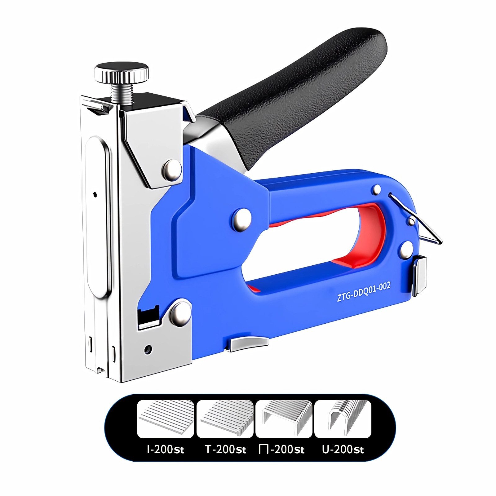 Praktischer 4-in-1 Handtacker für Heimwerker, Hobby und Haushalt. Mit vier Klammerarten (D-, U-, I- und T-Typ) und einstellbarer Schusskraft eignet er sich ideal für Reparaturen, Dekorationen und Befestigungen verschiedenster Materialien.
