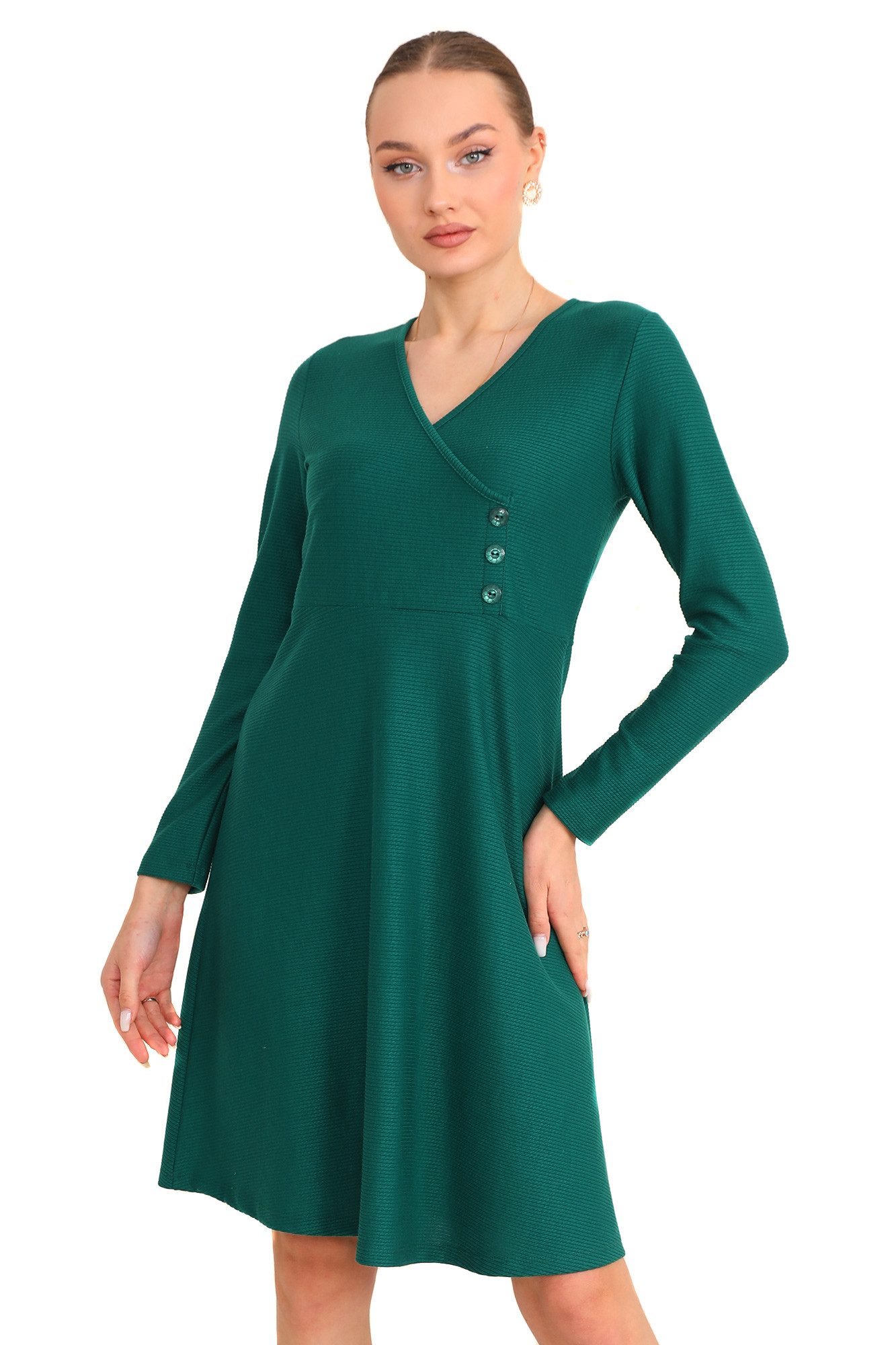 Der V-Ausschnitt in Wickeloptik betont das Dekolleté auf dezente Weise und wird durch eine stilvolle Knopfleiste mit drei Zierknöpfen ergänzt – ein echter Hingucker mit Funktion. Die langärmelige Form macht das Kleid ideal für die Übergangszeit sowie für kühlere Tage.