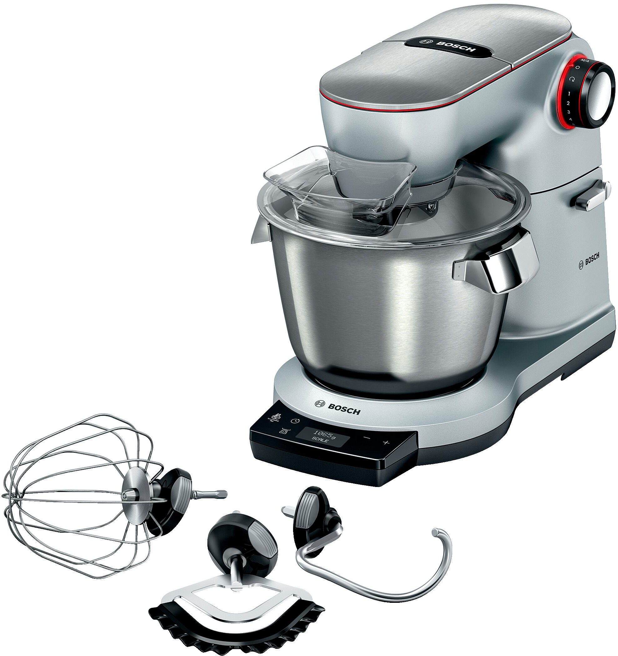 Впередe Vorteile | Abdeckungen der Antriebe aus gebürstetem Edelstahl Ausbaufähig mit individuellem Sonderzubehör (nicht im Lieferumfang enthalten). Automatisch die perfekte Konsistenz von Hefeteig, Sahne und Eischnee erhalten – dank der intelligenten Automatik-Programme SensorControl Plus. Mit dem integrierten Timer können zusätzlich Rührzeiten individuell eingestellt werden. Einfach praktisch! Dank der integrierten Waage können alle Rezept-Zutaten direkt in der Schüssel und im Mixer exakt abgewogen werden. Gerät erkennt angeschlossenes Zubehör und passt die Geschwindigkeit perfekt an. Große Edelstahl-Rührschüssel mit 5,5 l Kapazität und zwei Griffen für bis zu 3,5 kg Rührteig oder 1,5 kg Mehl plus Zutaten bei Hefeteig. Große Zubehörauswahl Hohe Sicherheit durch die Abdeckung der Antriebe Jeder Antrieb und auch das passende Zubehör haben die gleiche Farbmarkierung Wiedereinschaltsicherung |