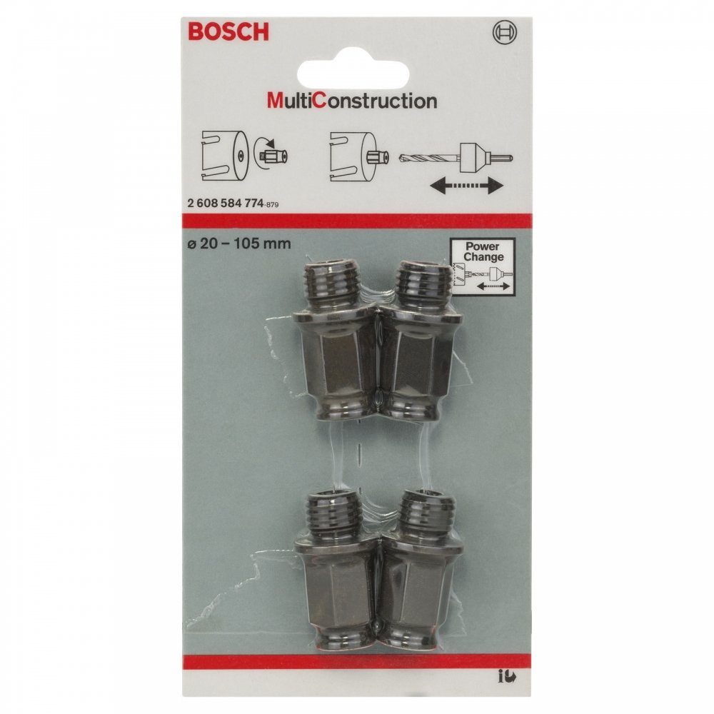 Das vierteilige Verlängerungsadapter-Set ermöglicht schnelles Wechseln von Lochsägen des Typs Multi Construction LS und leichtes Entfernen des Bohrkerns. Für Kompatibilität mit dem Bosch Quick Change-Adapter lassen sich die Verlängerungsadapter ganz einfach in das Gewinde von Lochsägen des Typs Multi Construction schrauben. Es ist für Akku- und Netzbohrschrauber geeignet. Das Set enthält 4 Adapter für Lochsägendurchmesser von 20 bis 105 mm.