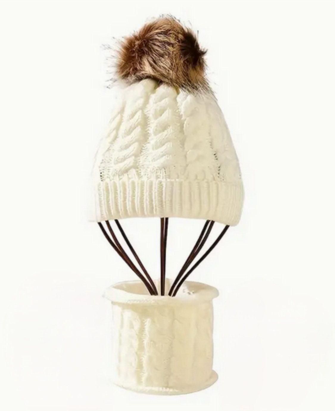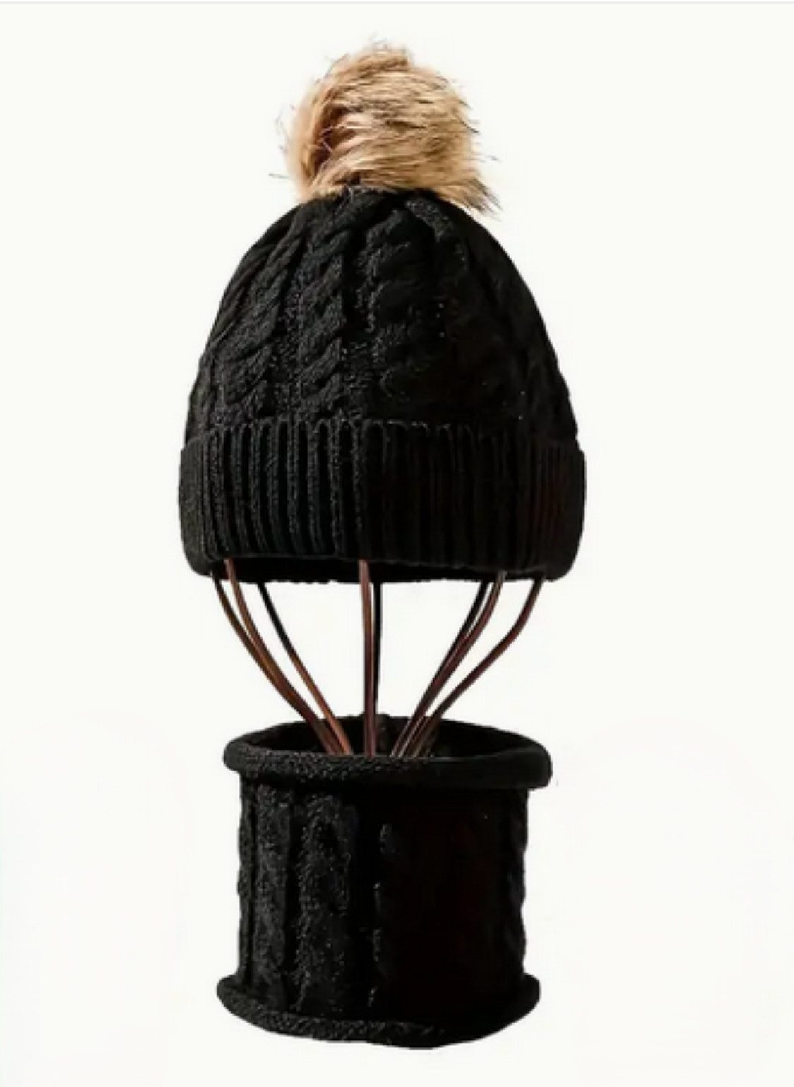 Die Strickmütze mit flauschigem Bommel aus Fellimitat und ein Loop Schal aus Wetter beständigem Baumwoll-/ Acryl- Gemisch