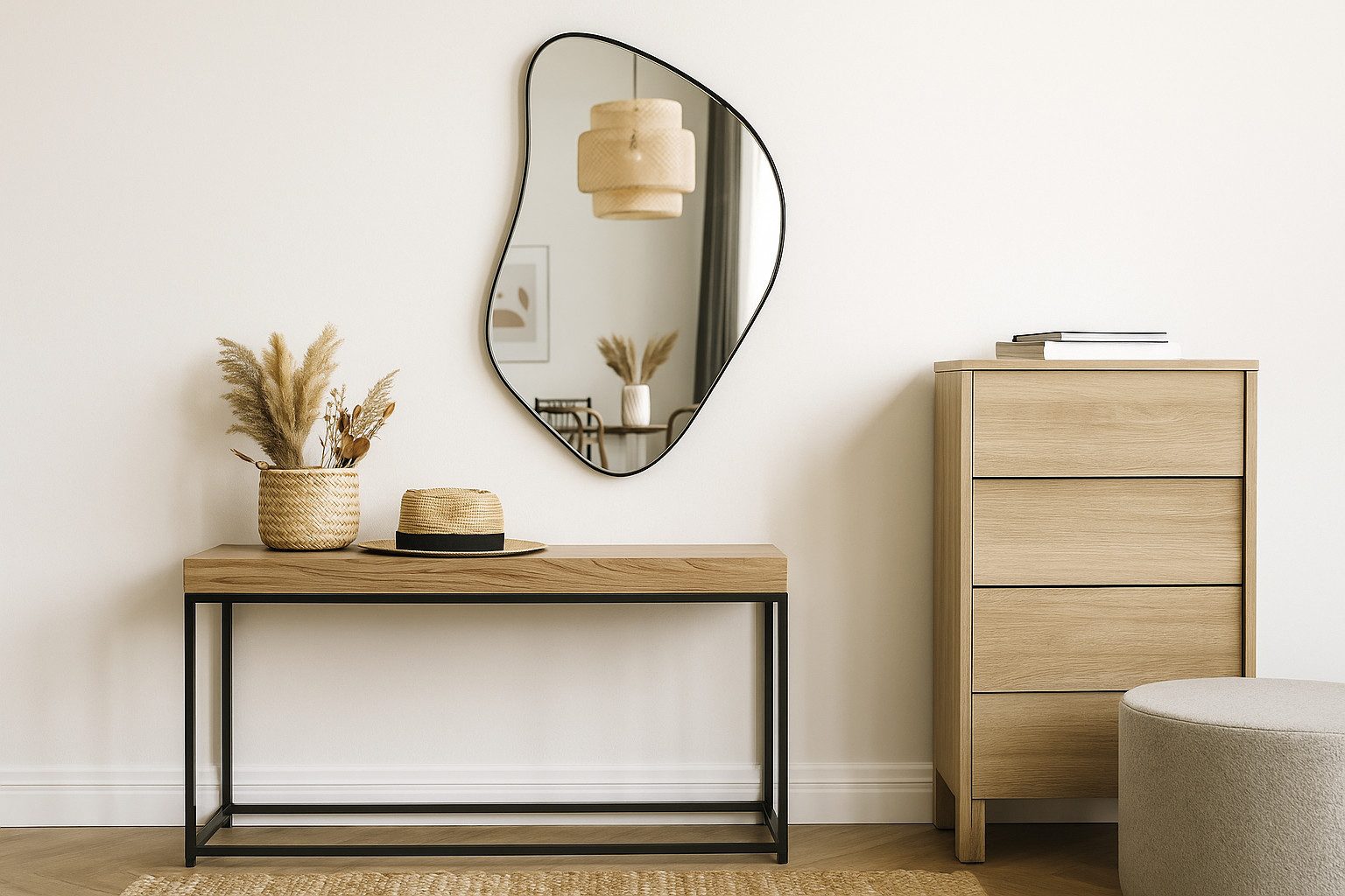 Unser asymmetrischer Wandspiegel kombiniert ein modernes, außergewöhnliches Design mit besonders hochwertigen Materialien. Der fein verarbeitete schwarze Metallrahmen wirkt edel und langlebig, während eine stabile MDF-Platte auf der Rückseite den Spiegel besonders robust macht.
