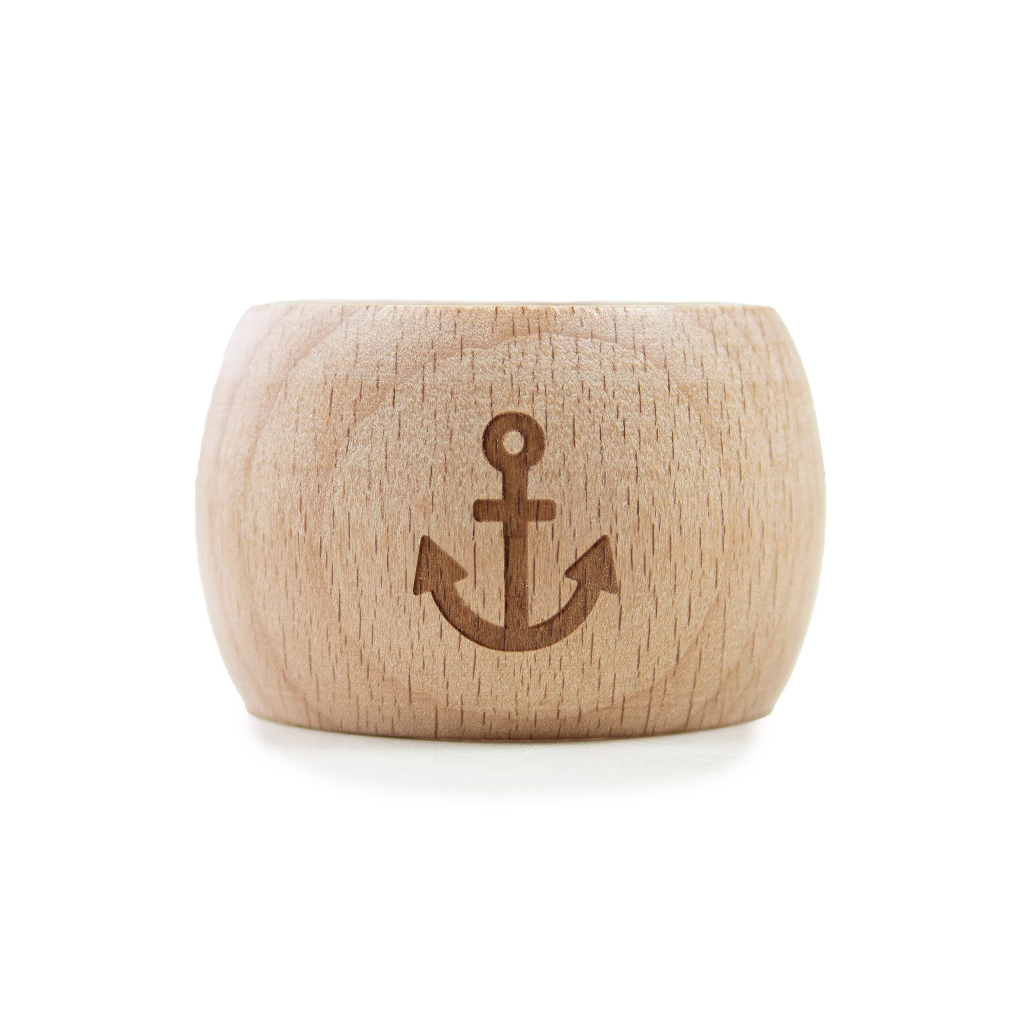 Mit diesem besonderen Ring aus Buchenholz können Sie als Gastgeber gleich doppelt punkten: Er eignet sich sowohl als Eierbecher wie auch als Serviettenring. Das Anker-Motiv wird präzise eingraviert und verleiht Ihrer Tischdekoration einen nordischen Akzent. Ob im Alltag oder zu besonderen Anlässen – die Ringe setzen im Handumdrehen einen maritimen Blickfang. Mit einem Innendurchmesser von ca. 40 mm sind sie für Stoff- und Papierservietten gleichermaßen geeignet. Die individuelle Holzmaserung macht jedes Stück zu einem Unikat. Die Ringe werden in einer Holzwerkstatt in Slowenien gedrechselt und anschließend in Deutschland graviert. Holz bietet dabei eine natürliche Alternative zu Materialien wie Kunststoff oder Metall und trägt durch seine Wiederverwertbarkeit zu einer langlebigen Nutzung bei. Pflegehinweis für die Nutzung als Eierbecher: Reiben Sie das Holz vor dem ersten Gebrauch mit Sonnenblumenöl oder ähnlichem neutralen Öl ein. Nach Benutzung bitte mit lauwarmem Wasser abwaschen und mit einem Tuch abtrocknen. Bitte nicht im Geschirrspüler reinigen. Es empfiehlt sich die Ölung in regelmäßigen Abständen zu wiederholen. Je nach Öl kann sich die Holzfarbe verändern. Maße ca.: Höhe: 3,2 cm Außendurchmesser: 5 cm Innendurchmesser: 4 cm
