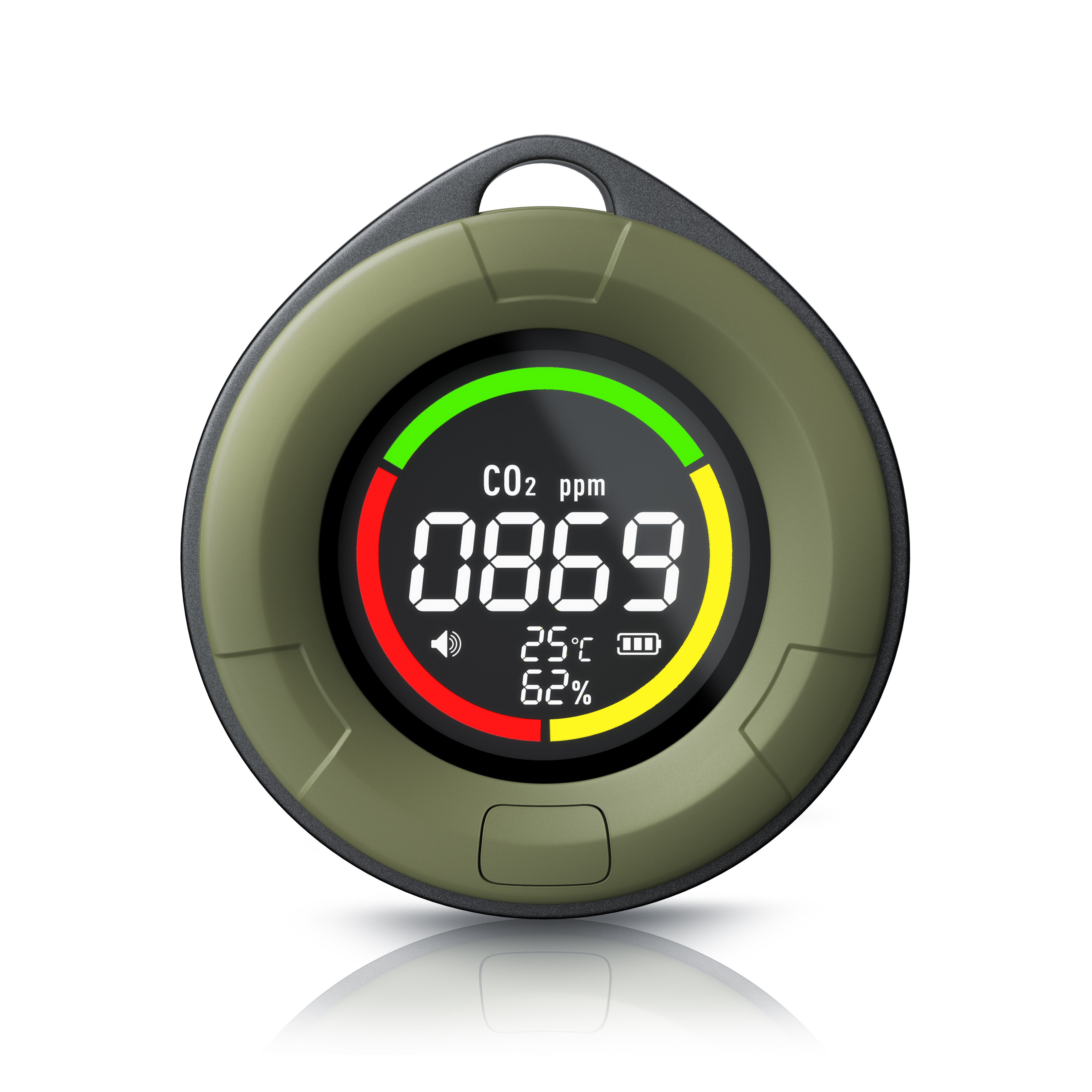 Funktionen | CO2 Messung, Luftqualitätsmessung, Uhrzeit, Alarm, Wecker, Temperatur, Luftfeuchtigkeit, integrierter Akku; Lüftungsempfehlung; CO2-Alarm |