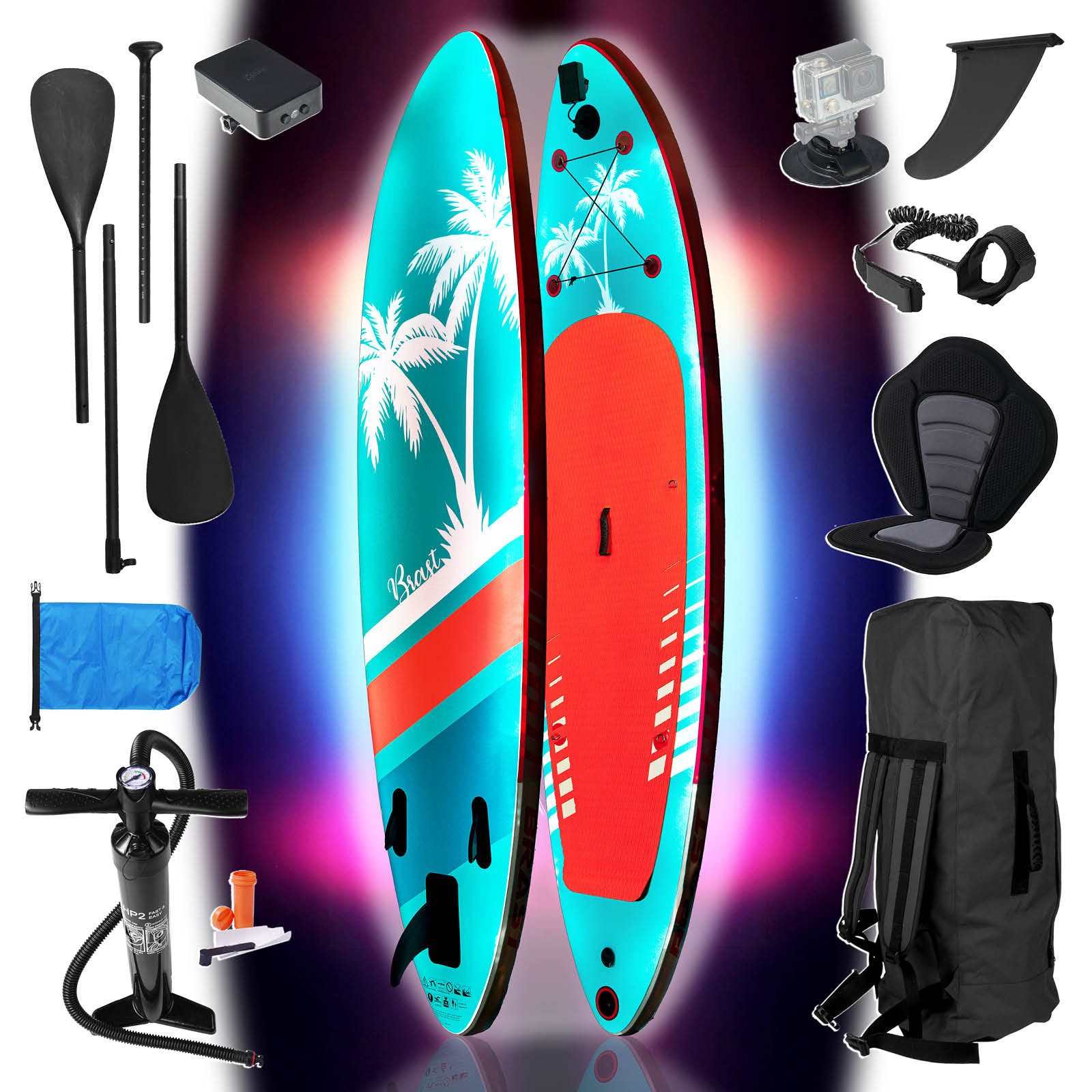 Lieferumfang | BRAST SUP Board LED 2 in 1 Alu-Paddel (4tlg.) Transportrucksack Fußschlaufe 10 Liter Tasche Kajak-Sitz Zentralfinne Action-Cam-Halterung Doppelhub-Pumpe Reparatur-Kit LED-Steuerungsbox mit Anschlusskabel Lade-Netzteil LED-Befestigungsvorrichtung Aufbauanleitung |