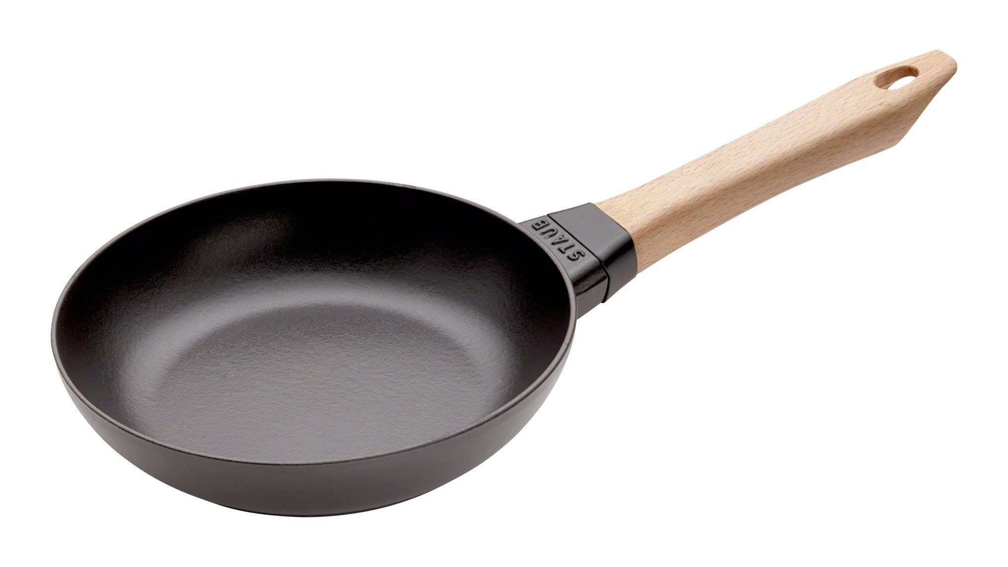 Staub Pans Bratpfanne 28 cm, Gusseisen, Schwarz Staub Rustikale Universalpfanne Zum Anbraten, Rösten, Schmoren Ansprechende Gusseisen-Holz-Kombination Optimale Wärmeverteilung und -speicherung Für alle Herdarten geeignet Beschreibung In der gusseisernen Pfanne von STAUB mit 28 cm Durchmesser gelingen mühelos saftige Steaks, aromatische Gemüsepfannen, gebratener Fisch und schmackhafte Soßen. Der ergonomisch geformte Holzgriff ist hitzeisolierend und schützt somit vor Verbrennungen und erleichtert zugleich die Handhabung der Gusseisenpfanne auf dem Herd sowie das Umfüllen der Speisen in die Servierschüssel. Der schwarze, gusseiserne Pfannenkörper überzeugt durch kurze Erhitzungszeiten, optimale Wärmeverteilung und -speicherung. Dadurch eignet sich die Pfanne nicht nur zum krossen Anbraten, sondern ebenfalls zum schonenden Schmoren, z.B. von Kohl-Gerichten. Auf einer geeigneten Unterlage ziert die Pfanne optisch auch den gedeckten Tisch: Dank des Zusammenspiels des Gusseisens mit dem handlichen Buchenholzgriff macht die Pfanne Lust auf traditionelle Familienrezepte, gemeinsame Mahlzeiten und gemütliches Beisammensein. Mithilfe der praktischen Aufhängeöse kann die Pfanne platzsparend verstaut werden. Zur Zubereitung von Fleisch, Fisch, Gemüse, Schmorgerichten, uvm. Geeignet für Elektroherd, Gasherd, Halogenherd, Glaskeramikkochfeld oder Induktionsherd Glatter Boden zur schonenden Verwendung auf empfindlichen Kochfeldern Energieeffizientes Kochen dank der speziellen Materialeigenschaften von Gusseisen Maße mit Griff (LxBxH): 51 x 29 x 7,2 cm, Durchmesser: 28 cm, Boden: 21,5 cm Gewicht: 2,5 kg Eigenschaften Farbe: Schwarz Hitzebeständigkeit: 240,00 ºC Kältebeständigkeit: -20,00 ºC Material: Gusseisen Griffart: Stielgriff Deckel vorhanden: Ja Induktion: Ja Gefrierschrank geeignet: Ja Herdplatten geeignet: Ja Lieferumfang: 1 Abmessungen Gewicht netto: 2,50 kg Volumen: 2,00 l Produktlänge: 51,00 cm Produktbreite: 29,00 cm Produkthöhe: 7,20 cm Produkthöhe ohne Deckel: 5,00 cm Oberer Durchmesser: 28,00 cm Bodendurchmesser: 21,50 cm Grifflänge: 10,50 cm