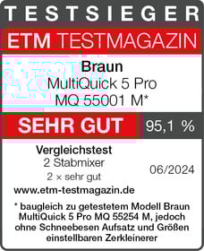 Testurteil von ETM TESTMAGAZIN vom 31.05.2024, Ausgabe 06/2024, Seite 50-65: "SEHR GUT | 95,1 % - baugleich zu getestetem Modell Braun MultiQuick 5 Pro MQ 55254M, jedoch ohne Schneebesen Aufsatz und Größen einstellbaren Zerkleinerer"
