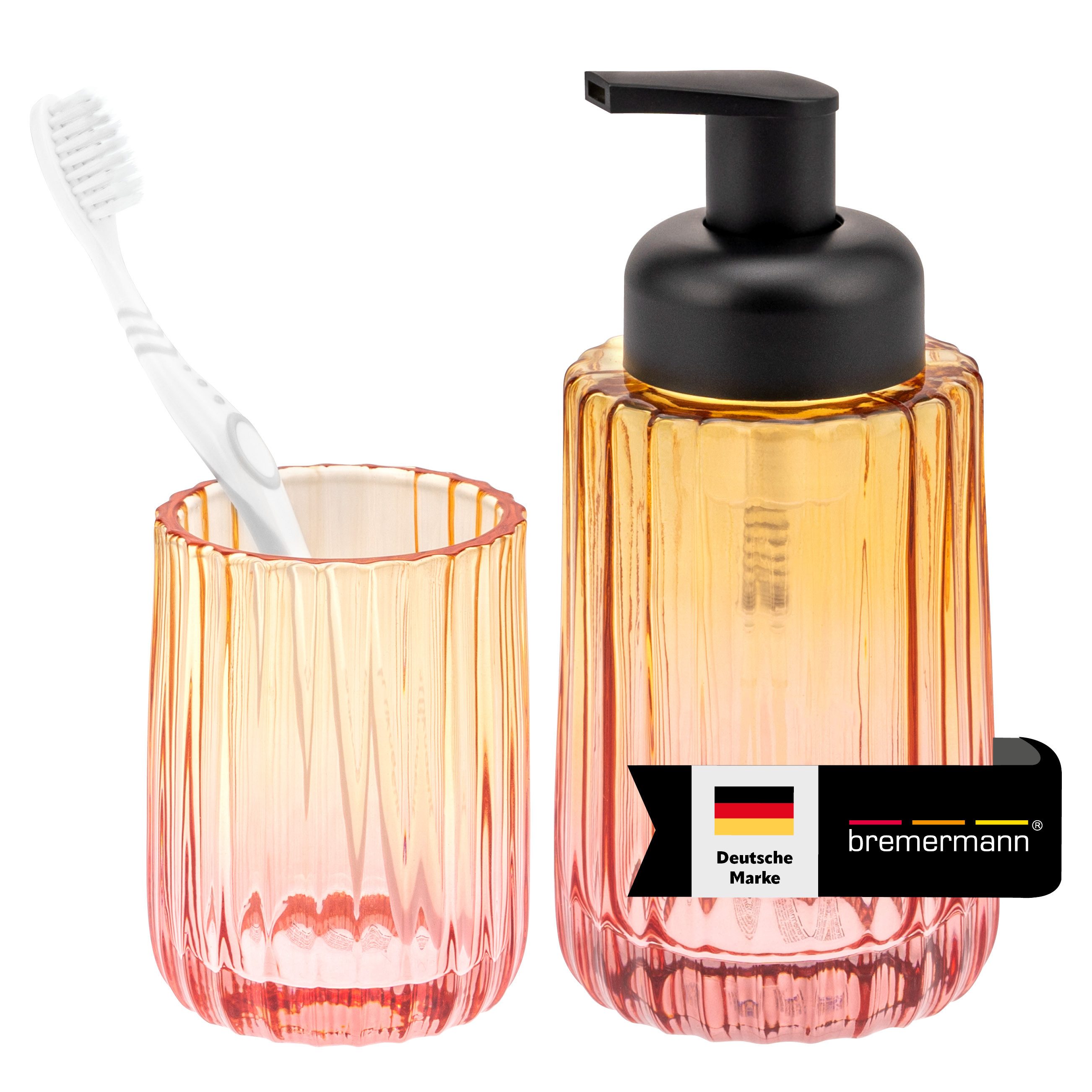 Das stilvolle Set besteht aus 1x Schaum-Seifenspender und 1x Zahnputzbecher. Es verleiht Ihrem Badezimmer entspannende Atmosphäre und setzt modische Akzente.