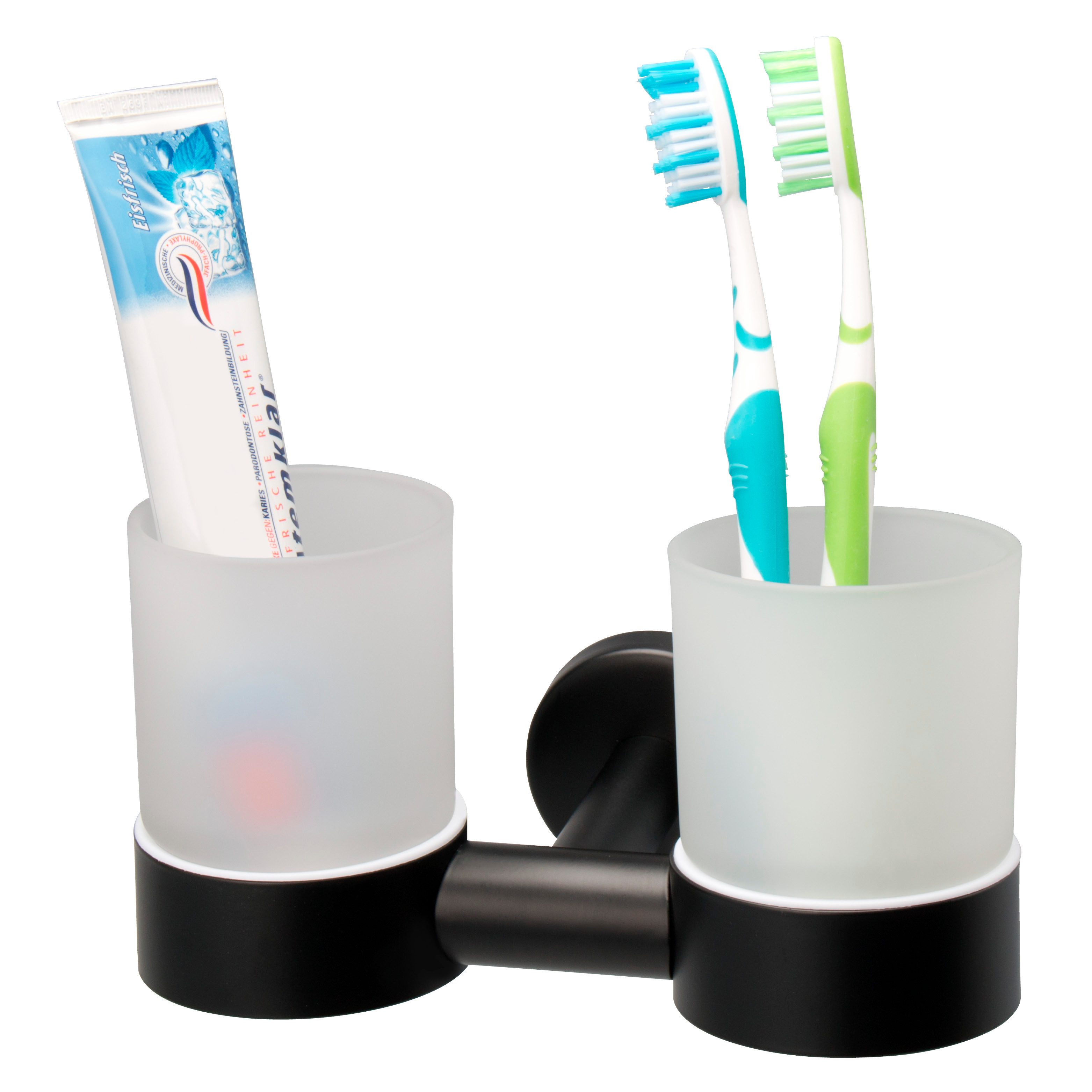 Der Zahnputzbecherhalter besteht aus satiniertem Glas und hochwertigem, rostfreiem Edelstahl in mattem Schwarz. Diese Materialien sorgen nicht nur für eine ansprechende Optik, sondern garantieren auch eine hohe Widerstandsfähigkeit und Langlebigkeit.