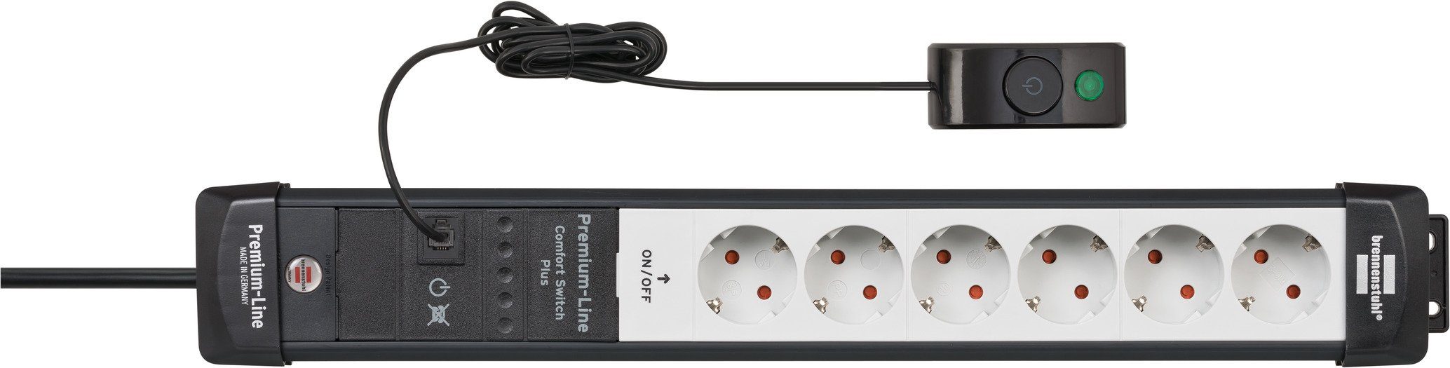 Die Premium-Line Comfort Switch Plus 6er Mehrfach-Steckdosenleiste von Brennenstuhl in der Farbe schwarz/grau und 3m Kabel besticht durch ihre Qualität und Sicherheit in allen Bereichen. Sie verfügt nicht nur über einen erhöhten Berührungsschutz, sondern überzeugt außerdem durch folgende Eigenschaften: * Formschöne Steckdosenleiste mit komfortablem, externem Hand-/Fußschalter * Robuster und formschöner Hand-/Fußschalter mit 1,5 m sehr flexibler Steuerleitung. Schalter ist mittels RJ-11-Verbindung steck- und verlängerbar. Dadurch ist eine sehr einfache und flexible Installation möglich * Schaltzustandsanzeige am Hand-/Fußschalter * Zur Montage geeignet * Praktische Kabelaufnahme * Mit Aufhänge-Vorrichtung * Schutzkontakt-Steckdosen in 45°-Anordnung, auch für Winkelstecker * Steckdosen mit erhöhtem Berührungsschutz