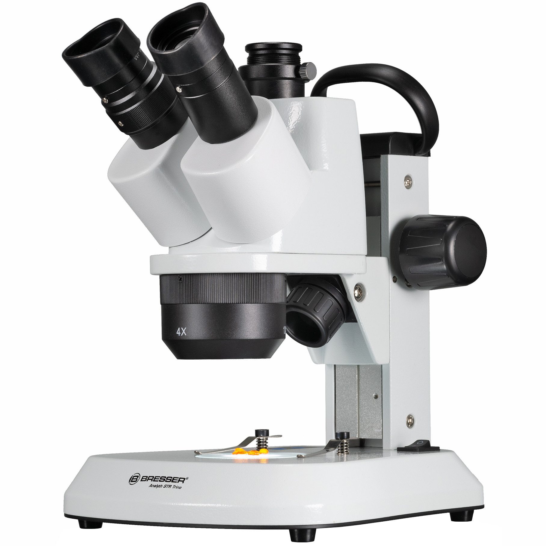 Lieferumfang | Mikroskop mit 3 Vergrößerungen, 10x; 20x; 40x, Trinokularer Tubus, einstellbar, Metallstativ mit LED-Beleuchtung, Netzteil und Batteriefach, 2 Okulare mit Gummiaugenmuscheln, Glas-Objektplatte, Kunststoff-Objektplatte (schwarz/weiß), Staubschutzhülle, Bed |