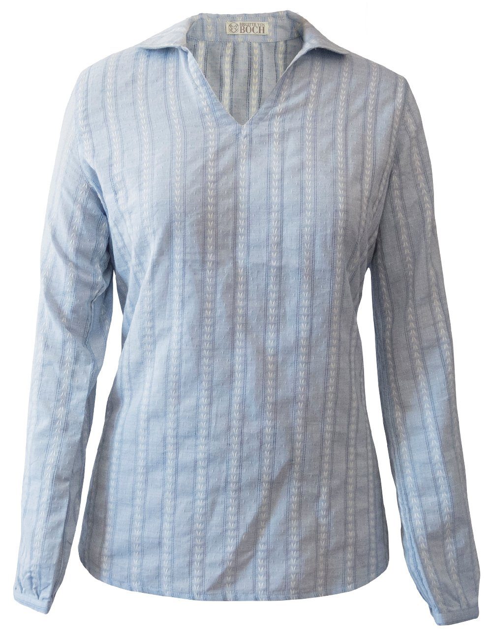 Feminine Sommer-Bluse aus leichter Baumwolle im traumhaften Ibiza-Look! Die feinen weißen Stickereien auf der hellblauen Baumwollbluse heben zusammen mit einem zarten Lochmuster den einzigartigen Stil hervor, der immer auch Freiheit, Leichtigkeit und Lebensfreude ausstrahlt! Mit kleinem Kragen und V-Ausschnitt sorgt die Tunika für einen femininen Sitz. Dazu verstellbare Ärmelmanschetten mit Knebelknopf. Hellblau/Bestickt. Длина ca. 73 cm. 100% Baumwolle. Feinwäsche.