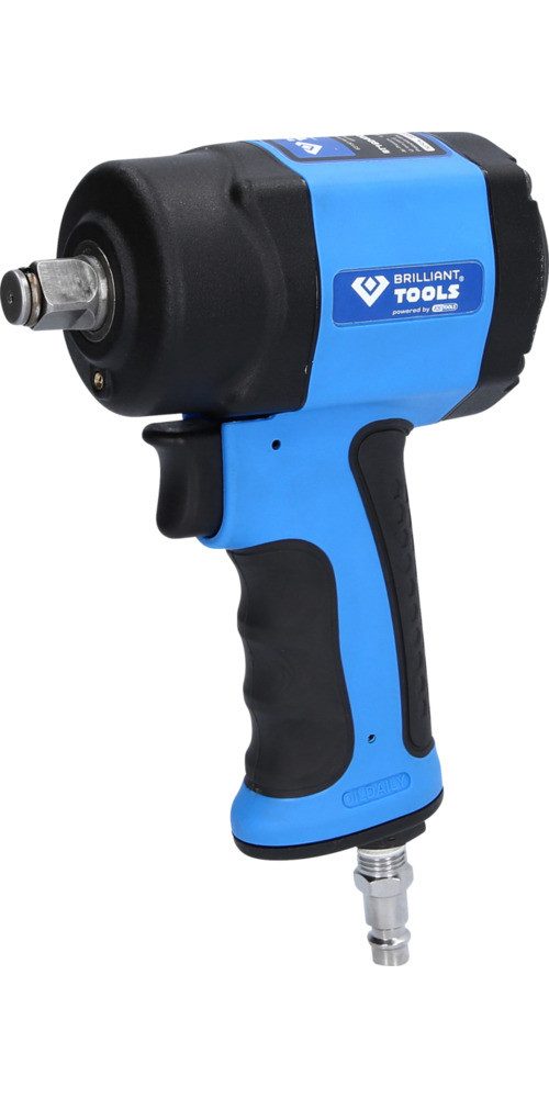 Der extrem kompakte, robuste und leistungsstarke BRILLIANT TOOLS 1/2“ Mini-Druckluft-Schlagschrauber BT160400 unterstützt Sie sowohl beim Reifenwechsel als auch bei anderen Reparaturen. Durch seine maximal 1.240 Nm im Lösebereich sind festsitzende Schrauben oder Muttern, auch an engsten Stellen, kein Problem mehr. Trotz seiner geringen Размер ist er ein wahres Kraftpaket. Er reduziert, aufgrund seines Gewichtes von nur 1,2 kg, spürbar alle typischen Belastungen bei Schraubarbeiten im Bereich der Nacken-, Schulter-, Arm- und Rückenmuskulatur. Die hohe Leistung wird durch ein Hochleistungs-Jumbo-Schlagwerk erzeugt, welches durch die Lebensdauer-Fettschmierung absolut wartungsfrei ist. Bei regelmäßiger Schmierung des Luftwerks, durch das mitgelierte Öl, haben Sie lange Freude an Ihrem Schlagschrauber. Das Drehmoment zum Anzug der Schrauben oder Muttern ist in 3-Stufen einstellbar. Die Abluft wird durch den ergonomisch geformten, kälteisolierenden Handgriff nach unten abgeführt. Dieser ist gummiert und bietet einen rutschfesten Griff, der dazu noch vor Vibrationen schützt. Der 1/4" Kupplungsstecker ist ebenfalls im Lieferumfang enthalten, somit ist der Schlagschrauber direkt einsatzbereit.