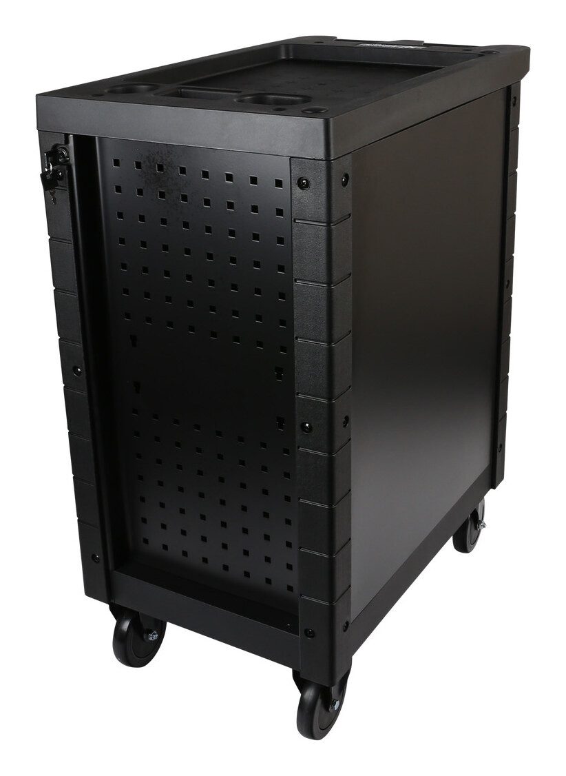 Der hochwertig pulverbeschichtete Profi-Werkstattwagen ist immer dort, wo er gerade gebraucht wird! Lästiges hin und her laufen gehört der Vergangenheit an. Mithilfe der ergonomischen in die Kunststoffablage integrierten Schiebegriffe lässt er sich ziemlich leicht durch die Werkstatt manövrieren und dabei schützt der Kantenschutz an den Ecken bei Kollisionen. Dank seiner 2 Feststellbremsen, an den Lenkrollen, bleibt er sicher am Zielort stehen. Mehr Platz! Der Werkstattwagen hat sieben Schubladen. Zwei Schubladen sind besonders hoch und bieten somit auch für Bohrmaschinen und anderen großen Werkzeugen ausreichend Platz. Durch die seitliche Schlüssellochung kann mit den richtigen Halterungen zusätzlicher Stauraum geschaffen werden. Все Schubladen sind kugelgelagert und auch bei voller Beladung von 30 kg maximale 100% ausziehbar. Das Erreichen der Werkzeuge ist also absolut problemlos möglich. Damit Ihr Profi Werkstattwagen nicht umkippt sind alle Schubladen einzeln verriegelt und können noch durch das Zentralschloss gesichert werden.