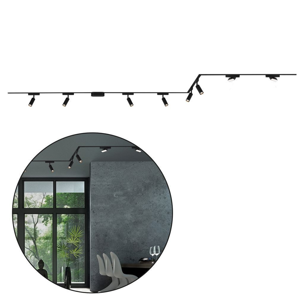 Das Set enthält ein Starterset (8025045), ein Erweiterungsset (8026025), zwei Tracklights (8030015), eine zusätzliche Schiene (8028005) und zwei Eckverbinder (8029005), alle in elegantem Schwarz.