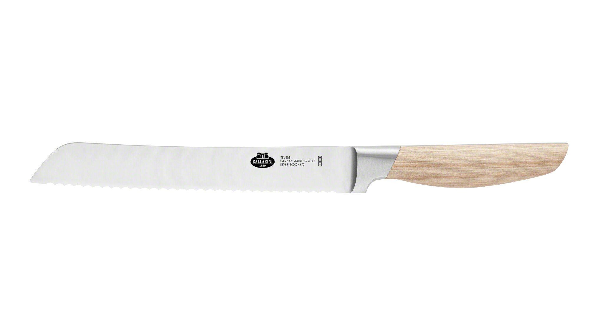 BALLARINI Tevere Brotmesser 20 cm mit Wellenschliff Mit dem Brotmesser der Serie Tevere von BALLARINI schneidest du Brot und Brötchen „senza stress“. Denn der hochwertige Wellenschliff des Küchenmessers gleitet mühelos durch jede noch so knusprige Brotkruste. Das Brotmesser hat eine Klingenlänge von 20 cm. Damit bietet es genug Schneidefläche für große Brotlaibe. Der ergonomische Griff aus Pakka-Holz ist besonders angenehm in der Haptik. Der Kropf des Brotmessers sorgt zusätzlich für gute Balance und schützt die Finger. Dank des extra scharfen Wellenschliffs gleitest du wie ein Profi durch jede noch so hartnäckige Brotkante, ohne das Brot unschön zu zerquetschen oder das Brotinnere aufzurauen. Der Griff des Küchenmessers ist aus poliertem Pakka-Holz gefertigt. Die helle Optik des Holzes trägt gemeinsam mit dem anspruchsvollen Design zu einem „bella“ Gesamteindruck bei. Unkompliziert, schnell und bequem. Mit dem scharfen Brotmesser von Tevere hast du immer frisch aufgeschnittenes Brot auf deinem Tisch. Ermüdungsfreies Arbeiten durch ergonomischen Griff Anspruchsvolles Design Gute Schnitthaltigkeit Sehr gute Korrosionsbeständigkeit Fingerschutz für mehr Sicherheit Aus deutschem, rostfreiem Stahl Eigenschaften Farbe: Natur Material: Deutsch. Edelstahl Griffart: Flach-Erl Schleifart: Wellenschliff Herstellungsart: geschweißt Lieferumfang: 1 Klingenhärte: 54-56 HRC Grifffarbe: Natur Griffmaterial: Pakka Holz Abmessungen Gewicht netto: 0,26 kg Produktlänge: 34,70 cm Produktbreite: 2,20 cm Produkthöhe: 3,40 cm Klingenlänge: 20,00 cm Grifflänge: 15,00 cm Handle width: 2,20 cm Klingenbreite: 0,20 cm