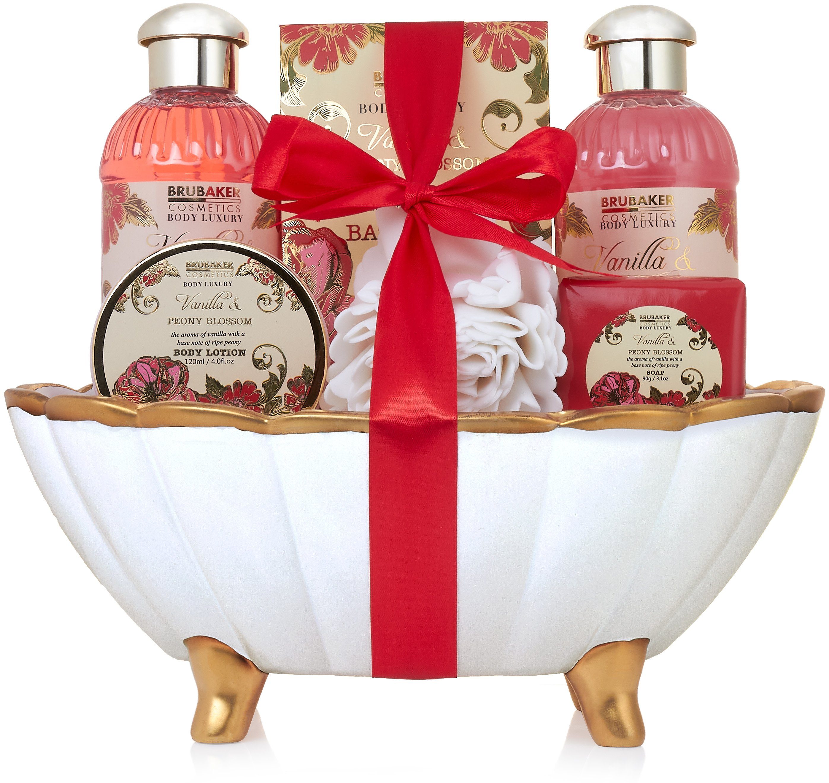 Das sinnliche Bade-Geschenkset mit Aromen von Pfingstrose und Vanille beinhaltet 250 ml Duschgel, 250 ml Schaumbad, 120 ml Körpermilch, 200 g Badesalz, 90 g Seife, einen Peelingschwamm aus EVA und eine weiße Keramikwanne in Muschelform mit goldfarbenem Rand.