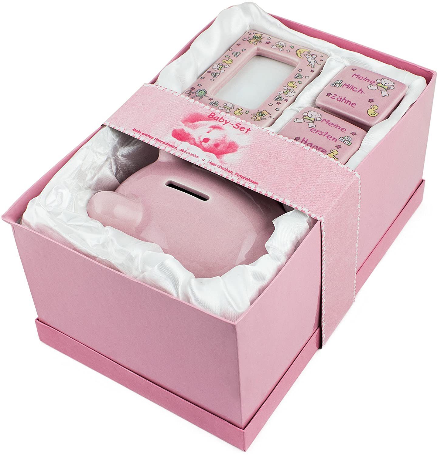 Mit diesem Baby-Geschenkset verschenken Sie bleibende, wertvolle Erinnerungen für das ganze Leben! Das Set ist eine tolle Geschenkidee für frische Eltern, zur Taufe oder zur Geburt. Im Set enthalten sind ein Sparschwein mit der Aufschrift 'Mein erstes Sparschwein', zwei Keramik-Döschen für die ersten Haare und Milchzähne sowie ein Keramik-Bilderrahmen. Die süßen, kindgerechten Motive versprühen gute Laune und machen dieses Geschenk zu einem echten Lieblingsstück. Die Geschenkbox ist in Blau oder Rosa gehalten, mit schimmerndem, weißem Satin ausgeschlagen sowie mit Klarsichtfenster und zusätzlichem Deckel ausgestattet.