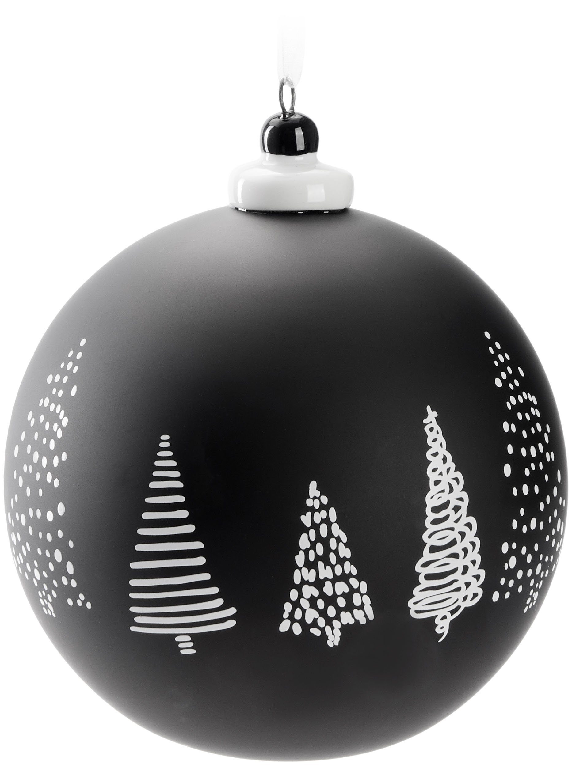 Bereite Deinen Weihnachtsbaum in diesem Jahr auf ein luxuriöses Upgrade vor – mit unserer Premium Weihnachtskugel. Diese zauberhafte Weihnachtskugel bringt den Zauber der Feiertage in dein Zuhause und wird garantiert zum Blickfang deines festlich geschmückten Christbaums. Mit einem bezaubernden Tannenbaum-Design auf der Kugel, das verschiedene Baumkreationen zeigt, wird diese Kugel in Mattschwarz mit weißen Tannenbäumen oder in Mattweiß mit schwarzen Bäumen angeboten.