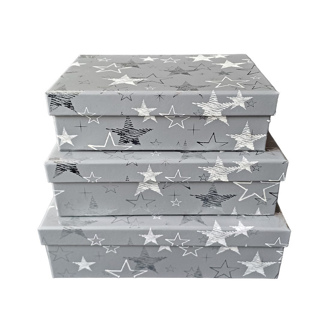 Diese exquisiten Kartons sind aus stabilem Karton gefertigt und mit einem eleganten silbergrauen Papier bezogen, das mit zauberhaften, unterschiedlich großen und gestalteten Sternen bedruckt ist. Ein wahrer Hingucker, der jedem Raum ein Funkeln verleiht.