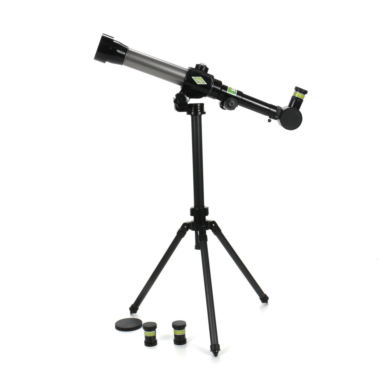 Dieses Kinder-Teleskop ermöglicht Jungen und Mädchen den Einstieg in die Welt der Astronomie. Das Starter-Set beinhaltet Linsen in 3 Zoom-Größen für die 20-, 30- und 40-fache Vergrößerung. Mit Hilfe des Scharfstellrades wird die Brennweite der Linse eingestellt. Für den richtigen Kipp-Winkel sowie die Höhe des Teleskops sorgen weitere Einstellräder, die extra für Kinderhände genormt wurden. Ein auf dem Fernrohr angebrachter Kompass hilft beim Sternenhimmel beobachten. Das Kinder-Teleskop lässt sich um ca. 24,5 cm in der Höhe verstellen. Drei Beine sorgen für festen Stand des um 360° drehbaren Teleskops. Es wird demontiert geliefert, ist jedoch mit 2 Handgriffen zusammengebaut. Beim ersten Mal sollte ein Erwachsener helfen. Das leichte Kinderteleskop ist aus Kunststoff und kann bei Bedarf einfach mit einem feuchten Lappen gereinigt werden. Fördern Sie den natürlichen Wissensdurst Ihres Kindes beim Entdecken von Sonne, Mond und Sternen mit Hilfe seines neuen, coolen Kinder-Teleskops. Wir wünschen viel Spaß dabei!