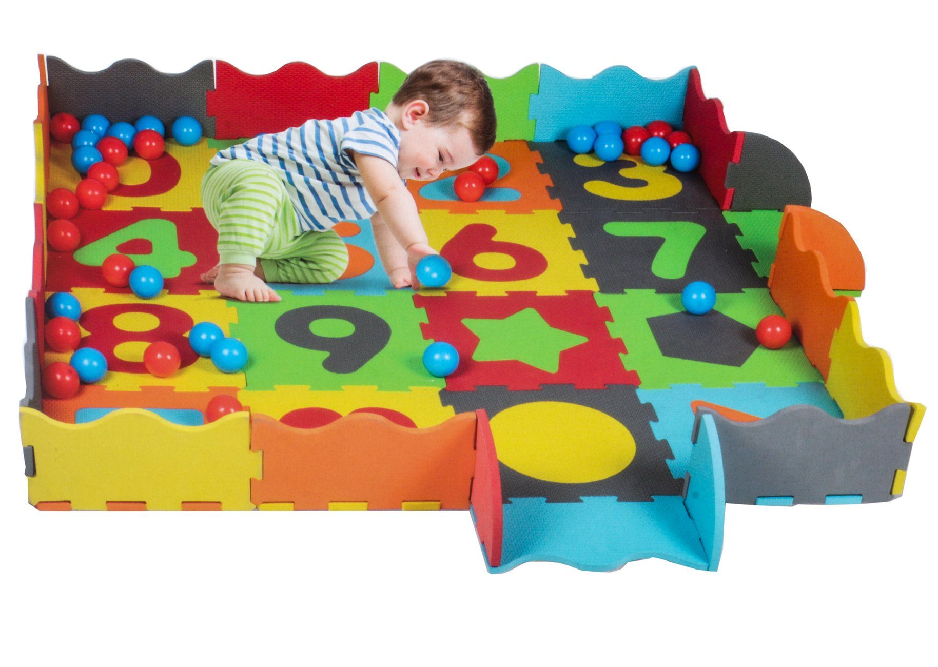Kleinkinder müssen sich ausprobieren. Das geht mit diesem Bällebad aus Schaumstoff-Teilen von Let‘s Play ganz prima. Die Schaumstoffballgrube besteht aus 93 Teilen, inklusive 40 bunte Kunststoffbälle. Das Bällebad enthält 16 bunte Bodenplatten, in deren Mitte jeweils eine Zahl (von 0 bis 9) oder ein Symbol wie Herz, Fünfeck, Kreis, Stern oder Quadrat eingelassen ist. Die Zahlen und Symbole lassen sich aus ihrer jeweiligen Bodenplatte herausnehmen und wie ein großes Puzzlestück wieder einsetzen. Das schult sowohl die Visualisierung als auch die Hand zu Auge-Koordination Ihres Kleinkindes. Eine ca. 15 cm hohe Schaumstoff-Absperrung verhindert, dass die Bälle herausrollen. Die vier Eckverbindungen lassen sich sowohl in die Umgrenzung einpassen als auch zu zwei offenen Einstiegen in die Ballgrube verarbeiten. Sollte Ihr Baby oder Kleinkind noch nicht ganz sicher auf den Beinen sein, kein Problem. Die Schaumstoffplatten sind ca. 0,8 cm dick und polstern etwaige kleine Stürze problemlos ab. Das leichte Bällebad wird in einem Kunststoffkoffer mit Tragegriff geliefert. Damit können Sie sogar auf Reisen gehen, ohne dass Ihr Nachwuchs auf seinen Lieblingsspielplatz verzichten muß. Wir wünschen viel Spaß beim Zuschauen und Mitspielen!