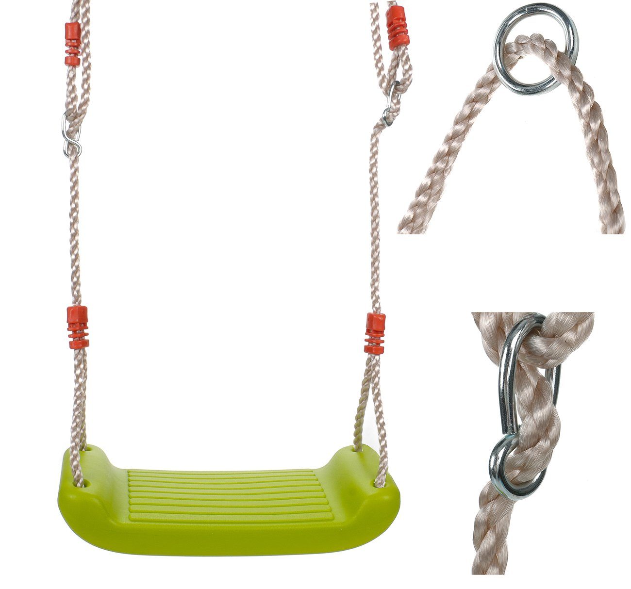 Kindern lieben Aktiv-Spielzeug und dabei sind Schaukeln ganz vorne in der Beliebtheitsskala. Diese Schaukel für Kinder von 3 bis 14 Jahren ist sicher und ideal für den Garten oder das Kinderzimmer. Die ergonomisch geformte Sitzfläche aus Kunststoff ist mit einem Profil rutschfest ausgestattet. Die ca. 14 mm dicken Seile sind aus fest verwebtem Kunstfasermaterial und lassen sich von ca. 120 bis auf ca. 200 cm verlängern. Die dafür benötigten Ringverbindungen sowie die beiden Ringe zur Befestigung der Schaukel bestehen aus stabilem Stahl und halten so Einiges aus. Die Befestigungsringe lassen sich entweder in ein Schaukelgestell oder, wie in der Betriebsanleitung beschrieben, in passende Halteösen einhängen. Ihre neue Kinderschaukel trägt bis zu 100 kg. Damit kann Ihr Nachwuchs richtig cool hin und her schwingen oder einfach mal seine Seele baumeln lassen. Machen Sie Ihre Kids glücklich und beschenken Sie die Kleinen mit der neuen Kinderschaukel. Wir wünschen gaaaanz viel Spaß beim Schaukeln!