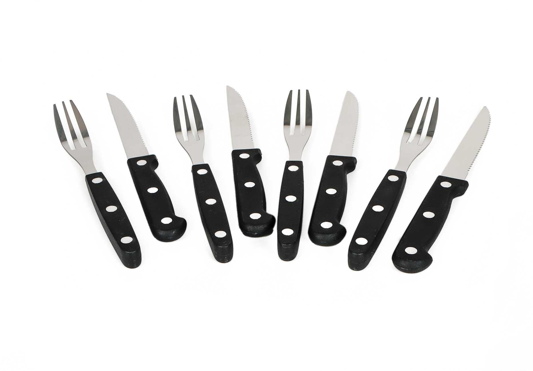 Dieses 8-teilige Steakbesteck besteht aus vier Steakmessern mit vier Gabeln. Das Besteckset von BBQ ist passend für alle Fleischsorten, wie Steaks und anderes Grillgut, lässt sich aber auch super zum Schneiden von Pizza, Hamburgern etc. nutzen. Messer und Gabel sind aus rostfreiem Edelstahl mit ergonomisch geformten Handgriff. Die Griffe aus robustem Kunststoff sind zusätzlich mit drei Metallnieten versehen, die für Langlebigkeit sorgen. Die gezahnten Messerklingen verfügen über eine Klingenstärke von ca. 1,2 mm, sind extra scharf und schneiden problemlos jedes Fleischstück. Neben den hochwertigen Materialien spricht vor allem das gute Design für Ihr neues Steak-Besteckset. Ob Zuhause am Esstisch, beim Grillfest im Garten oder in der Gastronomie, dieses Steakbesteck wird alle Fleischliebhaber begeistern. Wir wünschen viel Freude daran!