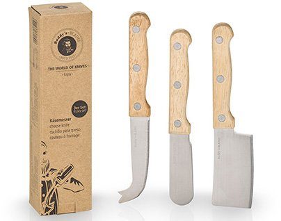 Dieses dreiteilige Messer-Set ist durch sein klassisches Design ein Hingucker auf jeder Käseplatte. Die Messer besitzen scharfe Klingen aus rostfreiem Stahl und edle Griffe aus echtem Holz.