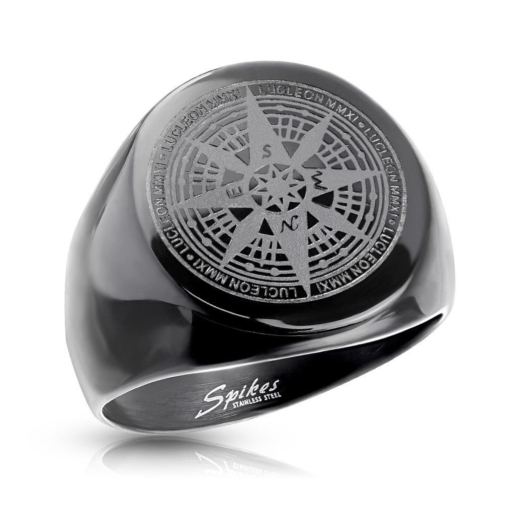 Markanter schwarzer Siegelring mit detailreichem Kompass aus Edelstahl für Herrrn