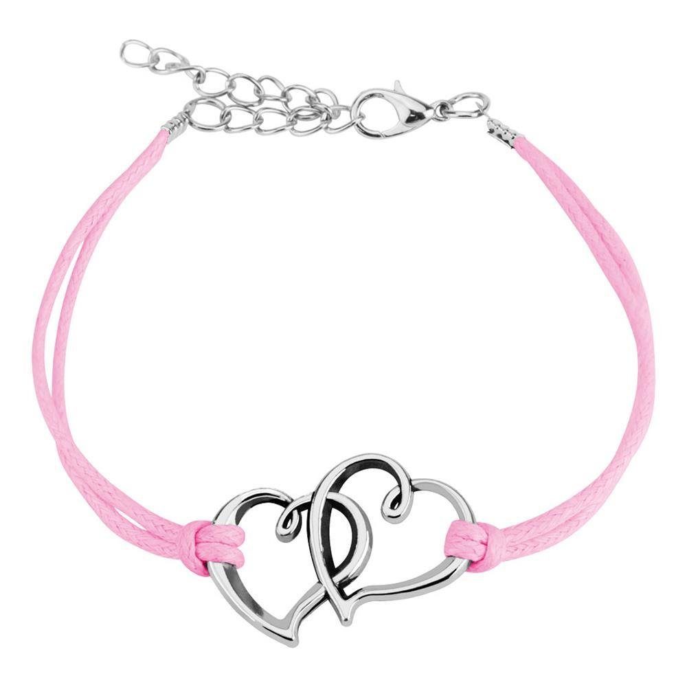 Außergewöhnliches Armband für Verliebte! Mittelpunkt dieses Bracelets sind die beiden ineinander verschlungenen Herzen. Farblich abgesetzt wurde das restliche Armband gestaltet, der Verschluss ist ein sicherer Karabiner.