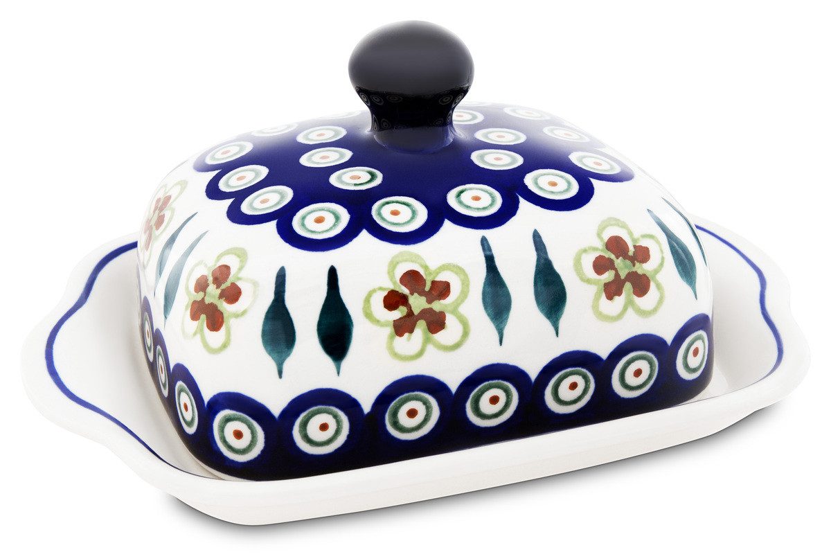Warum nur Butter servieren, wenn Sie mit dieser kunstvollen Butterdose auch ein Stück Natur auf den Tisch bringen können? Das bezaubernde, handbemalte Design aus roten und grünen Blumen, ergänzt durch die charakteristischen blauen Pfauenaugen, macht jede Mahlzeit zu einem kleinen Fest. Es ist, als ob eine Sommerwiese in Keramik eingefangen wurde!