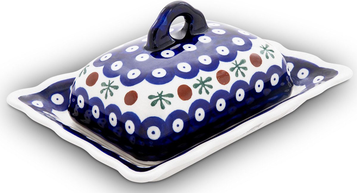 Das Muster ist ein harmonisches Spiel aus Farben und Formen mit einem tiefblauen Hintergrund, der die Basis für das dynamische Muster bildet. Weiße Kerne werden von dunkelblauen und weiteren weißen Kreisen umgeben, was dem Muster eine optische Tiefe verleiht. Grüne, tannenzweigartige Details und warmbraune Akzente bereichern das Design, das traditionelles Handwerk mit moderner Ästhetik verbindet. Robust und langlebig, ist diese Butterdose eine stilvolle Ergänzung für jede Mahlzeit.