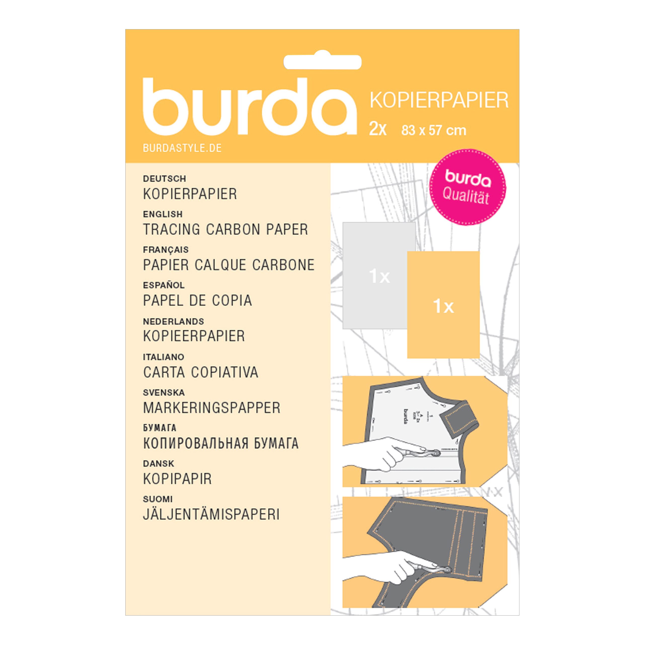Burda Kopierpapier Weiß / Gelb, 2 Bogen (je einer pro Farbe) in der Размер ca. 57 x 83 cm. Zum Durchpausen von Schnittmustermarkierungen und Konturen auf Stoff. Die Bogen sind einseitig beschichtet. Perfekte Hilfe für Näharbeiten, zum Übertragen von Schnittmusterkonturen, Abnähern, Passzeichen und Knopflöchern. Einfache Anwendung.