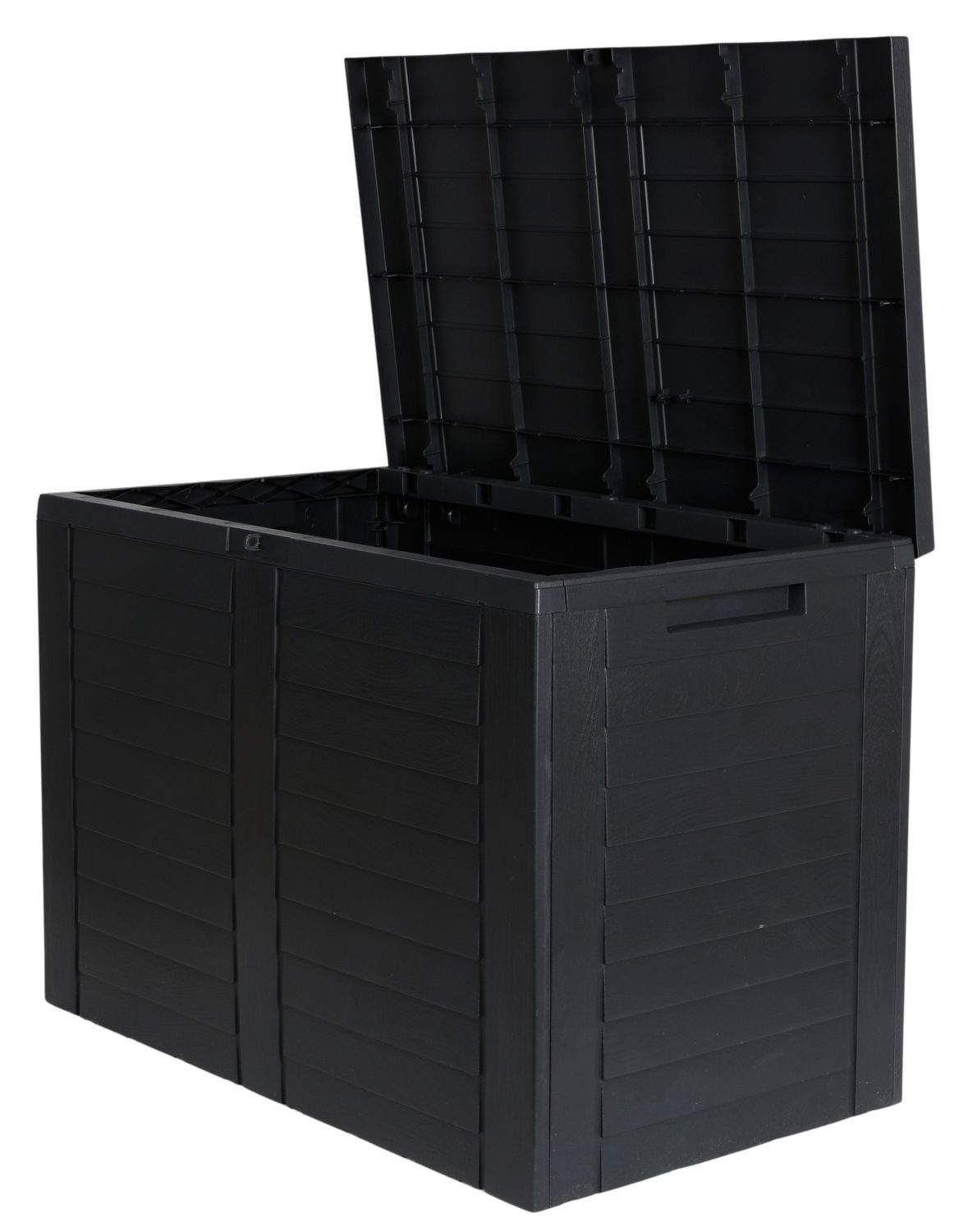 Die kleine Truhe in natürlicher Holzoptik aus widerstandsfähigem und witterungsbeständigem Kunststoff ist die ideale Aufbewahrungsmöglichkeit für den Balkon. So lassen sich Sitzpolster, Gartengerätschaften und andere Utensilien ordentlich verstauen. Durch das einfache Stecksystem ist die Box kinderleicht und schnell in nur wenigen Minuten zusammengebaut - ganz ohne Werkzeug.