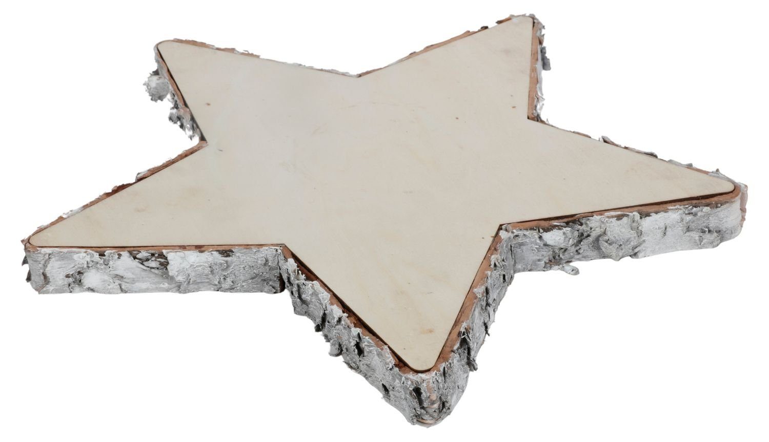 Dieses sternenförmige Holztablett mit einem Rand aus Baumrinde setzt Ihre Dekoration besonders gut in Szene. Das natürliche Material sorgt dabei für eine warme Wohnatmosphäre.
